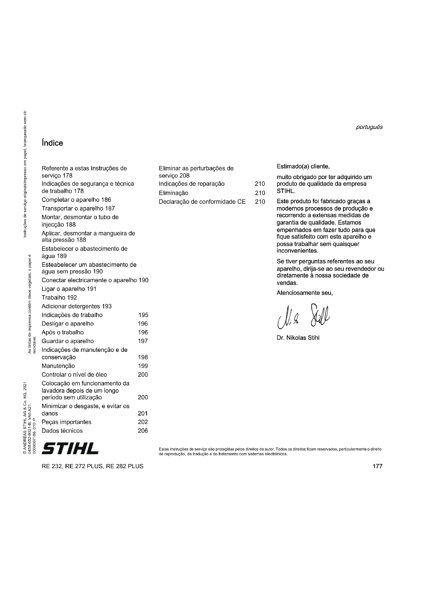 Estas Instruções de serviço são protegidas pelos direitos de autor. Todos os direitos ficam reservados, particularmente o direito de reprodução, da tradução e do tratamento com sistemas electrónicos. Índice Estimado(a) cliente, muito obrigado por ter adquirido um produto de qualidade da empresa STIHL. Este produto foi fabricado graças a modernos processos de produção e recorrendo a extensas medidas de garantia de qualidade. Estamos empenhados em fazer tudo para que fique satisfeito com este aparelho e possa trabalhar sem quaisquer inconvenientes. Se tiver perguntas referentes ao seu aparelho, dirija-se ao seu revendedor ou diretamente à nossa sociedade de vendas. Atenciosamente seu, Dr. Nikolas Stihl Referente a estas Instruções de serviço 178 Indicações de segurança e técnica de trabalho 178 Completar o aparelho 186 Transportar o aparelho 187 Montar, desmontar o tubo de injecção 188 Aplicar, desmontar a mangueira de alta pressão 188 Estabelecer o abastecimento de água 189 Esteabelecer um abastecimento de água sem pressão 190 Conectar electricamente o aparelho 190 Ligar o aparelho 191 Trabalho 192 Adicionar detergentes 193 Indicações de trabalho 195 Desligar o aparelho 196 Após o trabalho 196 Guardar o aparelho 197 Indicações de manutenção e de conservação 198 Manutenção 199 Controlar o nível de óleo 200 Colocação em funcionamento da lavadora depois de um longo período sem utilização 200 Minimizar o desgaste, e evitar os danos 201 Peças importantes 202 Dados técnicos 206 Eliminar as perturbações de serviço 208 Indicações de reparação 210 Eliminação 210 Declaração de conformidade CE 210RE 232, RE 272 PLUS, RE 282 PLUS português
