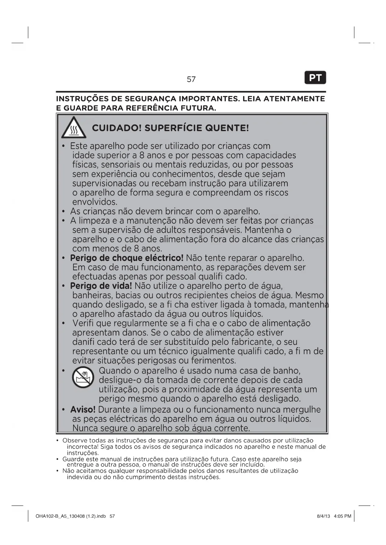 - Guarde o aparelho em local fresco e seco, afastado das crianças e dos animais domésticos. ESPECIFICAÇÕES Tensão nominal: 220-240 V~, 50/60 Hz Potência nominal: 600 W Classe de protecção: Classe II ELIMINAÇÃO O símbolo do contentor de lixo riscado determina que os equipamentos eléctricos e electrónicos usados (WEEE) sejam recolhidos de forma separada. Tais equipamentos podem conter substâncias perigosas e prejudiciais. Não elimine o aparelho no lixo doméstico não separado. Retorne-o a um ponto de recolha destinado à reciclagem de lixo electrónico (WEEE). Dessa forma, estará ajudando a preservar recursos e proteger o meio ambiente. Para mais informações, entre em contacto com o seu revendedor ou as autoridades locais. OHA102-B_A5_130408 (1.2).indb 62OHA102-B_A5_130408 (1.2).indb 62 8/4/13 4:05 PM8/4/13 4:05 PM63