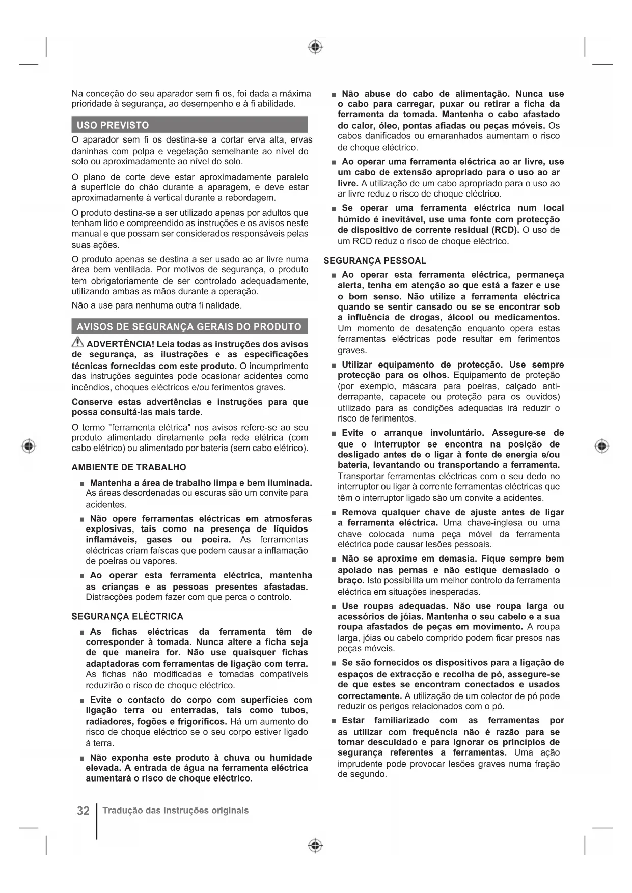 Opmerking Waarschuwing Onderdelen of accessoires worden apart verkocht32 Tradução das instruções originais Na conceção do seu aparador sem fi os, foi dada a máxima prioridade à segurança, ao desempenho e à fi abilidade. USO PREVISTO O aparador sem fi os destina-se a cortar erva alta, ervas daninhas com polpa e vegetação semelhante ao nível do solo ou aproximadamente ao nível do solo. O plano de corte deve estar aproximadamente paralelo à superfície do chão durante a aparagem, e deve estar aproximadamente à vertical durante a rebordagem. O produto destina-se a ser utilizado apenas por adultos que tenham lido e compreendido as instruções e os avisos neste manual e que possam ser considerados responsáveis pelas suas ações. O produto apenas se destina a ser usado ao ar livre numa área bem ventilada. Por motivos de segurança, o produto tem obrigatoriamente de ser controlado adequadamente, utilizando ambas as mãos durante a operação. Não a use para nenhuma outra fi nalidade. AVISOS DE SEGURANÇA GERAIS DO PRODUTO ADVERTÊNCIA! Leia todas as instruções dos avisos de segurança, as ilustrações e as especificações técnicas fornecidas com este produto. O incumprimento das instruções seguintes pode ocasionar acidentes como incêndios, choques eléctricos e/ou ferimentos graves. Conserve estas advertências e instruções para que possa consultá-las mais tarde. O termo "ferramenta elétrica" nos avisos refere-se ao seu produto alimentado diretamente pela rede elétrica (com cabo elétrico) ou alimentado por bateria (sem cabo elétrico).