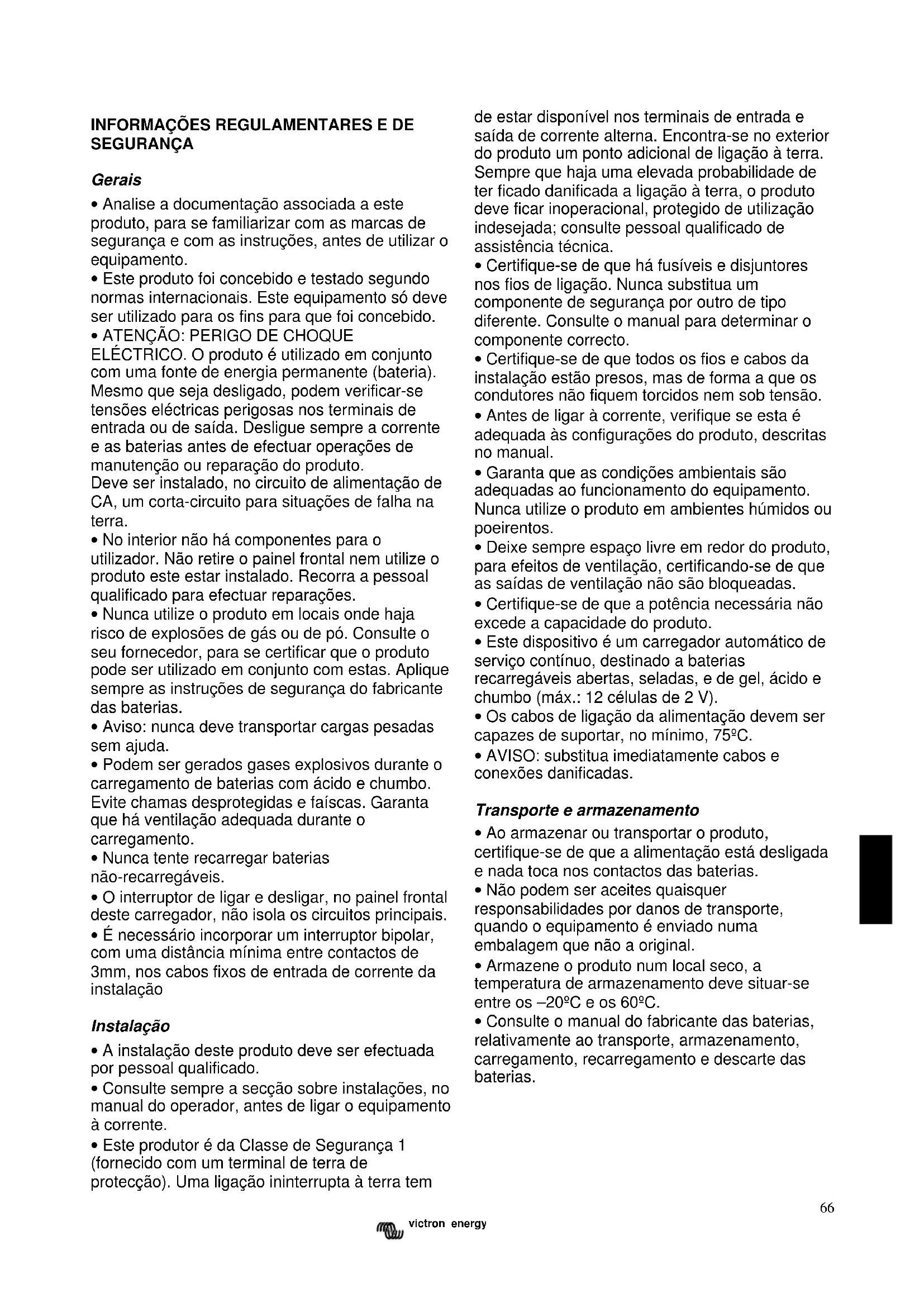 DESCRIÇÃO Tecnologia O Phoenix Charger é um carregador de baterias, integralmente comutado a alta-frequência. A entrada é corrigida electronicamente por um factor de potência, no primeiro nível de alimentação. O nível seguinte confere isolamento galvânico, com tensão contínua perfeita nos terminais de saída. Garante-se um estado de carregamento das baterias muito preciso, porque o processo de carregamento é regulado por um microcontrolador. Os componentes electrónicos internos estão protegidos da condensação e do pó por um revestimento especial, que assegura um longo tempo de vida útil ao carregador de baterias. Podem ser carregadas, neste carregador, duas baterias de alta capacidade e uma bateria adicional de baixa capacidade. Carregamento adaptativo O novo Phoenix Charger possui uma curva característica de carregamento adaptativa. Esta distingue-se de outras características de carregamento, em vários pontos; os 3 principais são: Carregamento Rápido, o Modo de Segurança das Baterias e o Modo para Todas as Estações. De uma forma geral, pode-se dizer que o Phoenix Charger se adapta às baterias que a ele forem ligadas. Carregamento rápido Na primeira fase, a fase de carga (Bulk) do ciclo de carregamento, as baterias são carregadas com uma corrente mais elevada do que a empregue pelos métodos tradicionais de carga. A fase de carga termina quando a tensão das baterias for 14,4V ou 28,8V. A partir de então, inicia-se a fase de absorção.Com base no tempo de carga medido, é calculado o tempo de absorção. Para o efeito, o microcontrolador do carregador procede à monitorização de vários parâmetros da bateria. Modo de segurança das baterias Mas e se a bateria necessitar de uma tensão de absorção mais elevada? O carregador eleva gradualmente a tensão aplicada à bateria, até que esta alcance a tensão de absorção definida. Esta fase designa-se “Modo de segurança das baterias”. Protege as baterias contra destruição por sobrecarregamento. O Phoenix Charger efectua compensação de temperatura. O carregador recalcula valores distintos, com base na temperatura da bateria. Modo para todas as estações Nos períodos em que não se utilizam as baterias, estando no entanto o carregador ligado à alimentação, o Phoenix Charger reduz a respectiva tensão flutuante. Desta forma, é reduzida a formação de gás nas baterias, para que não fique seca, após um longo período de inactividade. Para manter as baterias em boas condições, o Phoenix Charger, após uma semana, eleva a tensão aplicada. Este procedimento designa-se por absorção repetitiva. Funcionamento O carregador carrega as baterias com uma característica adaptativa em 4-estágios (consulte as especificações, na parte de trás, para obter mais pormenores). Pode ficar ligado continuamente às baterias, sem que se verifique maior formação de gases por sobrecarregamento. O carregador pode ser utilizado com vários tipos de baterias, mas a configuração de fábrica é para baterias de gel Sonnenschein A200 Dryfit. Consulte as especificações para obter informações acerca de outros tipos de baterias pré-programados. Para utilizar o carregador com outros tipos de baterias, contacte o seu fornecedor de baterias, para que este o informe das tensões correctas de carregamento. Se necessário, permita a regulação do Phoenix Charger. A corrente integral de carregamento do Phoenix Charger está dividida em duas saídas principais. Está disponível uma saída adicional, com capacidade de carga limitada, para carregar (por exemplo) uma bateria de arranque. O carregador está protegido contra curtos-circuitos nas saídas e temperatura ambiente demasiado elevada. Sensor de temperatura O Phoenix Charger é fornecido de fábrica com um sensor de temperatura. Destina-se a medir a temperatura das baterias, ajustando as tensões de carregamento em conformidade. Tal permite maior carregamento, assegurando também maior tempo de vida às baterias. Detecção de tensão A utilização da ligação para detecção de tensão permite compensar as perdas nos cabos das baterias.68 GB NL F D I DK ΕΛ N P E S Specs