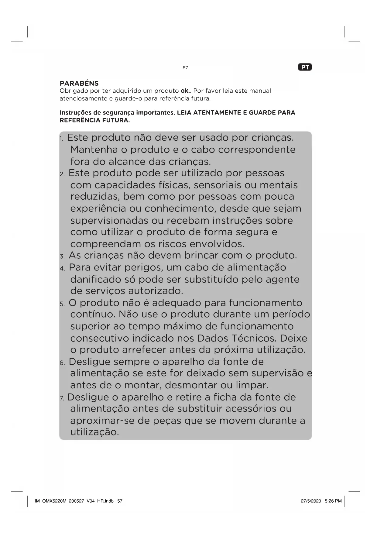 Tensão nominal : 220 – 240 V~, 50-60 Hz Potência nominal : 500 W Tempo de funcionamento contínuo : 2 minutos Classe de protecção : II ELIMINAÇÃO O símbolo do contentor de lixo riscado determina que os equipamentos eléctricos e electrónicos usados (WEEE) sejam recolhidos de forma separada. Tais equipamentos podem conter substâncias perigosas e prejudiciais. Não elimine o aparelho no lixo doméstico não separado. Retorne-o a um ponto de recolha destinado à reciclagem de lixo electrónico (WEEE). Dessa forma, estará ajudando a preservar recursos e proteger o meio ambiente. Para mais informações, entre em contacto com o seu revendedor ou as autoridades locais. IM_OMX5220M_200527_V04_HR.indb 62IM_OMX5220M_200527_V04_HR.indb 62 27/5/2020 5:26 PM27/5/2020 5:26 PMSE