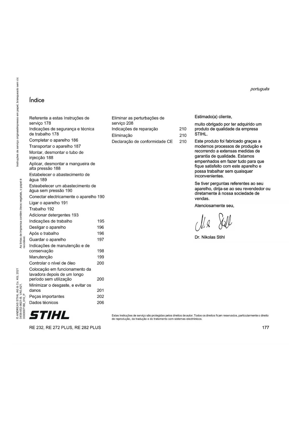 Estas Instruções de serviço são protegidas pelos direitos de autor. Todos os direitos ficam reservados, particularmente o direito de reprodução, da tradução e do tratamento com sistemas electrónicos. Índice Estimado(a) cliente, muito obrigado por ter adquirido um produto de qualidade da empresa STIHL. Este produto foi fabricado graças a modernos processos de produção e recorrendo a extensas medidas de garantia de qualidade. Estamos empenhados em fazer tudo para que fique satisfeito com este aparelho e possa trabalhar sem quaisquer inconvenientes. Se tiver perguntas referentes ao seu aparelho, dirija-se ao seu revendedor ou diretamente à nossa sociedade de vendas. Atenciosamente seu, Dr. Nikolas Stihl Referente a estas Instruções de serviço 178 Indicações de segurança e técnica de trabalho 178 Completar o aparelho 186 Transportar o aparelho 187 Montar, desmontar o tubo de injecção 188 Aplicar, desmontar a mangueira de alta pressão 188 Estabelecer o abastecimento de água 189 Esteabelecer um abastecimento de água sem pressão 190 Conectar electricamente o aparelho 190 Ligar o aparelho 191 Trabalho 192 Adicionar detergentes 193 Indicações de trabalho 195 Desligar o aparelho 196 Após o trabalho 196 Guardar o aparelho 197 Indicações de manutenção e de conservação 198 Manutenção 199 Controlar o nível de óleo 200 Colocação em funcionamento da lavadora depois de um longo período sem utilização 200 Minimizar o desgaste, e evitar os danos 201 Peças importantes 202 Dados técnicos 206 Eliminar as perturbações de serviço 208 Indicações de reparação 210 Eliminação 210 Declaração de conformidade CE 210RE 232, RE 272 PLUS, RE 282 PLUS português