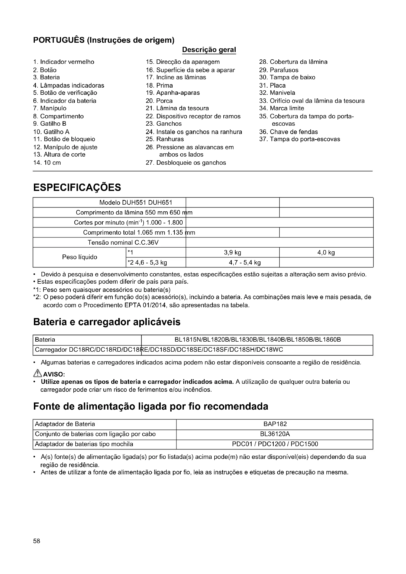 - Utilize apenas os tipos de bateria e carregador indicados acima. A utilização de qualquer outra bateria ou carregador pode criar um risco de ferimentos e/ou incêndios. Fonte de alimentação ligada por fio recomendada
