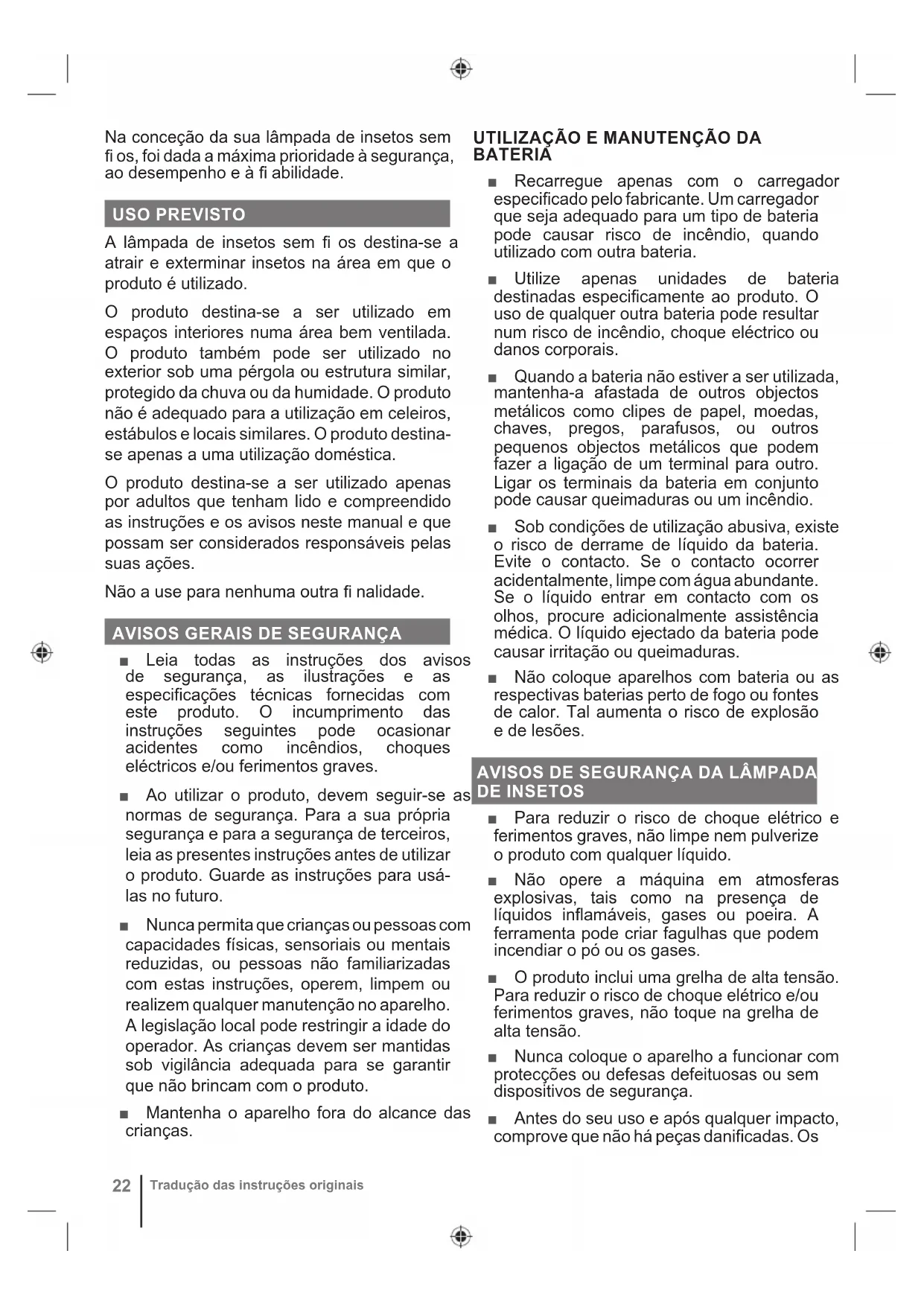 Opmerking Waarschuwing Onderdelen of accessoires worden apart verkocht22 Tradução das instruções originais Na conceção da sua lâmpada de insetos sem fi os, foi dada a máxima prioridade à segurança, ao desempenho e à fi abilidade. USO PREVISTO A lâmpada de insetos sem fi os destina-se a atrair e exterminar insetos na área em que o produto é utilizado. O produto destina-se a ser utilizado em espaços interiores numa área bem ventilada. O produto também pode ser utilizado no exterior sob uma pérgola ou estrutura similar, protegido da chuva ou da humidade. O produto não é adequado para a utilização em celeiros, estábulos e locais similares. O produto destina- se apenas a uma utilização doméstica. O produto destina-se a ser utilizado apenas por adultos que tenham lido e compreendido as instruções e os avisos neste manual e que possam ser considerados responsáveis pelas suas ações. Não a use para nenhuma outra fi nalidade.