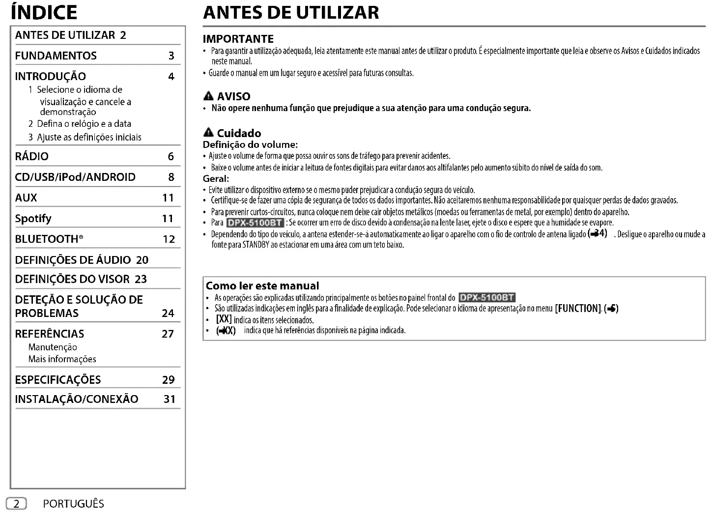 FUNDAMENTOS 3 INTRODUÇÃO 4 1 Selecione o idioma de visualização e cancele a demonstração 2 Defina o relógio e a data 3 Ajuste as definições iniciais RÁDIO 6 CD/USB/iPod/ANDROID 8 AUX 11 Spotify 11 BLUETOOTH® 12