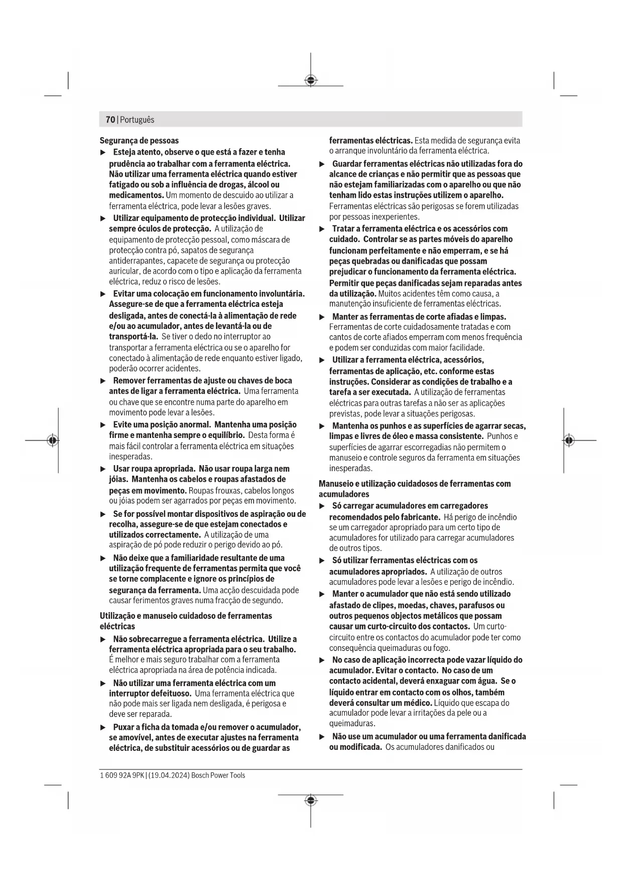1 609 92A 9PK | (19.04.2024) Bosch Power ToolsPortuguês | 77 – Fixe os pés da ferramenta elétrica com grampos convencionais à superfície de trabalho. Montagem numa mesa de trabalho Bosch As mesas de trabalho GTA da Bosch oferecem firmeza à ferramenta elétrica, sobre qualquer solo, devido aos pés de altura ajustável. As mesas de trabalho possuem bases de apoio para o apoio de peças longas. u Ler todas as indicações de aviso e instruções fornecidas com a mesa de trabalho. O desrespeito das indicações de aviso e das instruções pode causar choque elétrico, queimaduras e/ou ferimentos graves. u Montar corretamente a mesa de trabalho, antes de montar a ferramenta elétrica. É importante que a montagem seja perfeita, para evitar o risco de desmoronamento. – Monte a ferramenta elétrica na posição de transporte sobre a mesa de trabalho. Instalação flexível (não recomendada!) (ver figura B3) Se excecionalmente não for possível montar a ferramenta elétrica sobre uma superfície de trabalho plana e estável, pode usar como auxiliar uma proteção contra tombamento. u Sem a proteção contra tombamento a ferramenta elétrica não está segura e pode tombar especialmente ao serrar ângulos de meia-esquadria máximos horizontais e/ou verticais. – Rodar a proteção contra tombamento (18) para dentro ou para fora até que a ferramenta elétrica fique direita sobre a superfície de trabalho. Aspiração de pó/de aparas Pós de materiais como por exemplo, tintas que contém chumbo, alguns tipos de madeira, minerais e metais, podem ser nocivos à saúde. O contacto ou a inalação dos pós pode provocar reações alérgicas e/ou doenças nas vias respiratórias do utilizador ou das pessoas que se encontrem por perto. Certos pós, como por exemplo pó de carvalho e faia são considerados como sendo cancerígenos, especialmente quando juntos com substâncias para o tratamento de madeiras (cromato, produtos de proteção da madeira). Material que contém asbesto só deve ser processado por pessoal especializado. – Se possível deverá usar um dispositivo de aspiração de pó apropriado para o material. – Assegurar uma boa ventilação do local de trabalho. – É recomendável usar uma máscara de proteção respiratória com filtro da classe P2. Observe as diretivas para os materiais a serem processados, vigentes no seu país. u Evite a acumulação de pó no local de trabalho. Pós podem entrar levemente em ignição. A aspiração de pó/de aparas pode ser bloqueada por pó, aparas ou por estilhaços da peça a ser trabalhada. – Desligue a ferramenta elétrica e retire a bateria. – Aguardar até que o disco de serra esteja completamente parado. – Verificar a causa do bloqueio e eliminá-la. Aspiração integrada (verfiguraC) Para a fácil recolha das aparas deverá utilizar o saco do pó(37) fornecido. – Coloque o punho de transporte (3) na vertical. – Encaixe e rode o saco do pó (37) no adaptador de aspiração (50), de forma a que o pino do saco do pó engate no entalhe no adaptador de aspiração. Ao serrar, o saco do pó não deve entrar em contacto com as peças móveis do aparelho. Esvazie o saco do pó a tempo. u Verifique e limpe o saco de pó após cada utilização. u Para evitar perigo de incêndio, deverá remover o saco de pó para serrar alumínio. Aspiração externa Para a aspiração também é possível ligar ao adaptador de aspiração (50) uma mangueira de aspirador (Ø 35 mm). – Ligue a mangueira do aspirador ao adaptador de aspiração (50). O aspirador de pó deve ser apropriado para o material a ser trabalhado. Utilize um aspirador especial para aspirar pó que seja extremamente nocivo à saúde, cancerígeno ou seco. Substituir o disco de serra (ver figura D1−D4) u Antes de qualquer trabalho na ferramenta elétrica (p. ex. manutenção, troca de ferramenta, etc.) retire a bateria da mesma. Há perigo de ferimentos se o interruptor de ligar/desligar for acionado involuntariamente. u Para a montagem do disco de serra é necessário usar luvas de proteção. Há perigo de ferimentos em caso de contacto com a lâmina de serra. Só utilizar discos de serra com uma máxima velocidade admissível superior à velocidade da marcha em vazio da ferramenta elétrica. Utilize apenas discos de serra que correspondam aos dados característicos indicados neste manual de instrução e que sejam controlados conforme EN847‑1 e respetivamente marcados. Utilize apenas discos de serra recomendados pelo fabricante desta ferramenta elétrica e adequados para o material com que deseja trabalhar. Desta forma, evita-se o sobreaquecimento dos dentes de serra ao serrar. Desmontar o disco de serra – Coloque a ferramenta elétrica na posição de trabalho. – Gire a cobertura de proteção pendular(10) para trás e mantenha-a nesta posição. – Rode o parafuso de sextavado interior(51) com a chave sextavada interior(6mm) (43) e pressione em simultâneo o bloqueio do veio(31), até este engatar. Bosch Power Tools 1 609 92A 9PK | (19.04.2024)78 | Português – Mantenha o bloqueio do veio(31) pressionado e rode o parafuso de sextavado interior(51) para a direita (rosca à esquerda!). – Retire o flange de aperto(52). – Retire o disco de serra(30). – Reconduzir lentamente a tampa de proteção pendular para baixo. Montar o disco de serra u Durante a montagem, deverá observar que o sentido de corte dos dentes (sentido da seta sobre a lâmina de corte) coincida com o sentido da seta sobre a capa de proteção! Se necessário, deverá limpar todas as partes antes de serem montadas. – Gire a cobertura de proteção pendular(10) para trás e mantenha-a nesta posição. – Coloque o novo disco de serra no flange de aperto interior(53). – Coloque o flange de aperto(52) e o parafuso de sextavado interior(51). Pressione o bloqueio do veio(31) até este engatar, e aperte o parafuso de sextavado interior rodando para a esquerda. – Reconduzir lentamen
