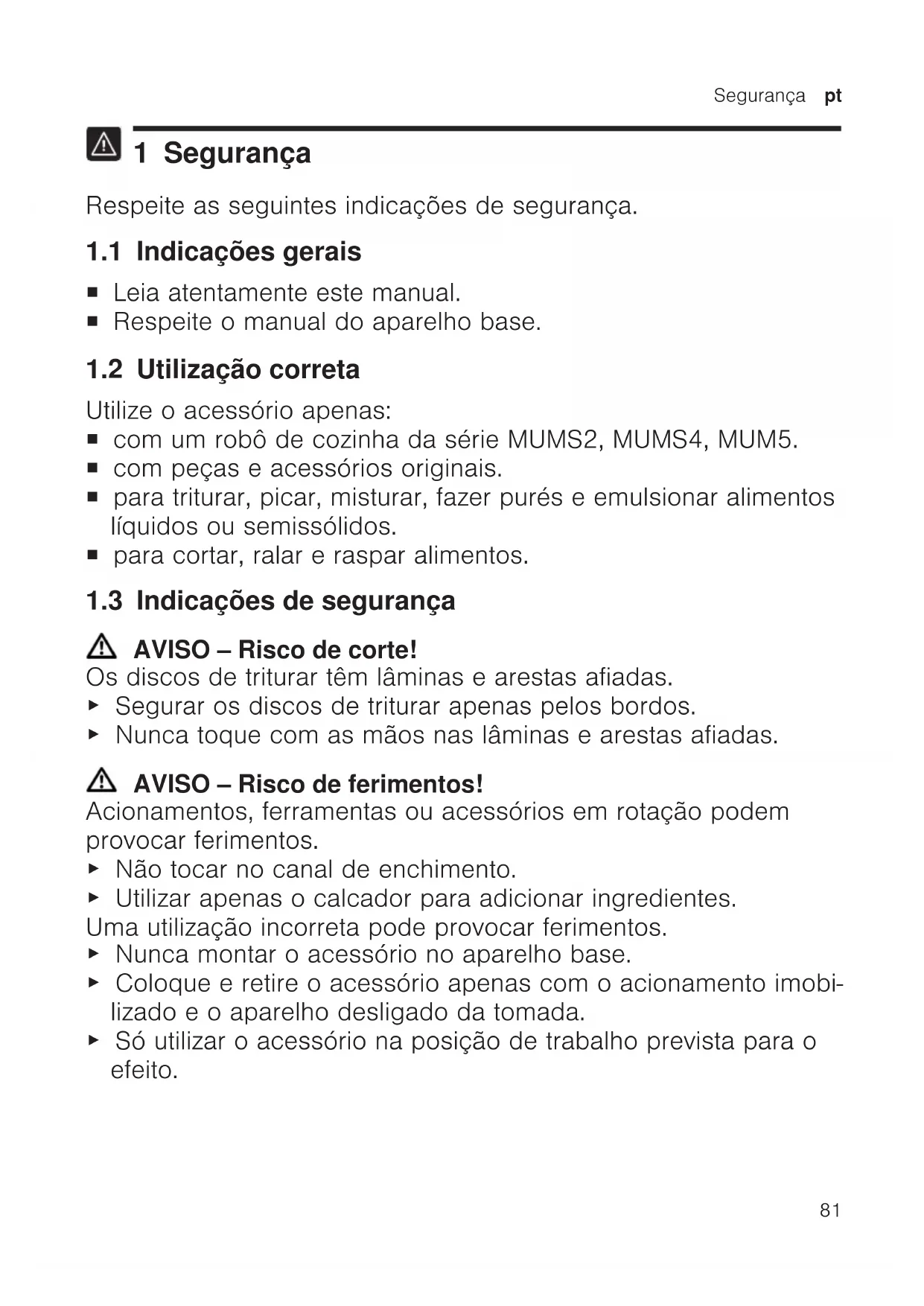1 Segurança Respeite as seguintes indicações de segurança. 1.1 Indicações gerais ¡ Leia atentamente este manual. ¡ Respeite o manual do aparelho base. 1.2 Utilização correta Utilize o acessório apenas: ¡ com um robô de cozinha da série MUMS2, MUMS4, MUM5. ¡ com peças e acessórios originais. ¡ para triturar, picar, misturar, fazer purés e emulsionar alimentos líquidos ou semissólidos. ¡ para cortar, ralar e raspar alimentos. 1.3 Indicações de segurança AVISO‒Risco de corte! Os discos de triturar têm lâminas e arestas afiadas. ▶ Segurar os discos de triturar apenas pelos bordos. ▶ Nunca toque com as mãos nas lâminas e arestas afiadas. AVISO‒Risco de ferimentos! Acionamentos, ferramentas ou acessórios em rotação podem provocar ferimentos. ▶ Não tocar no canal de enchimento. ▶ Utilizar apenas o calcador para adicionar ingredientes. Uma utilização incorreta pode provocar ferimentos. ▶ Nunca montar o acessório no aparelho base. ▶ Coloque e retire o acessório apenas com o acionamento imobi- lizado e o aparelho desligado da tomada. ▶ Só utilizar o acessório na posição de trabalho prevista para o efeito.pt Evitar danos materiais