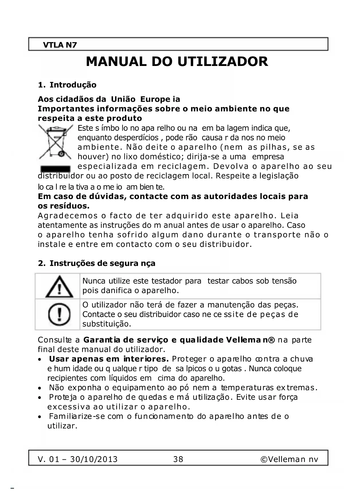 Nunca utilize este testador para testar cabos sob tensão pois danifica o aparelho. O utilizador não terá de fazer a manutenção das peças. Contacte o seu distribuidor caso ne ce ssite de peças de substituição. Consulte a Garantia de serviço e qualidade Velleman® na parte final deste manual do utilizador.