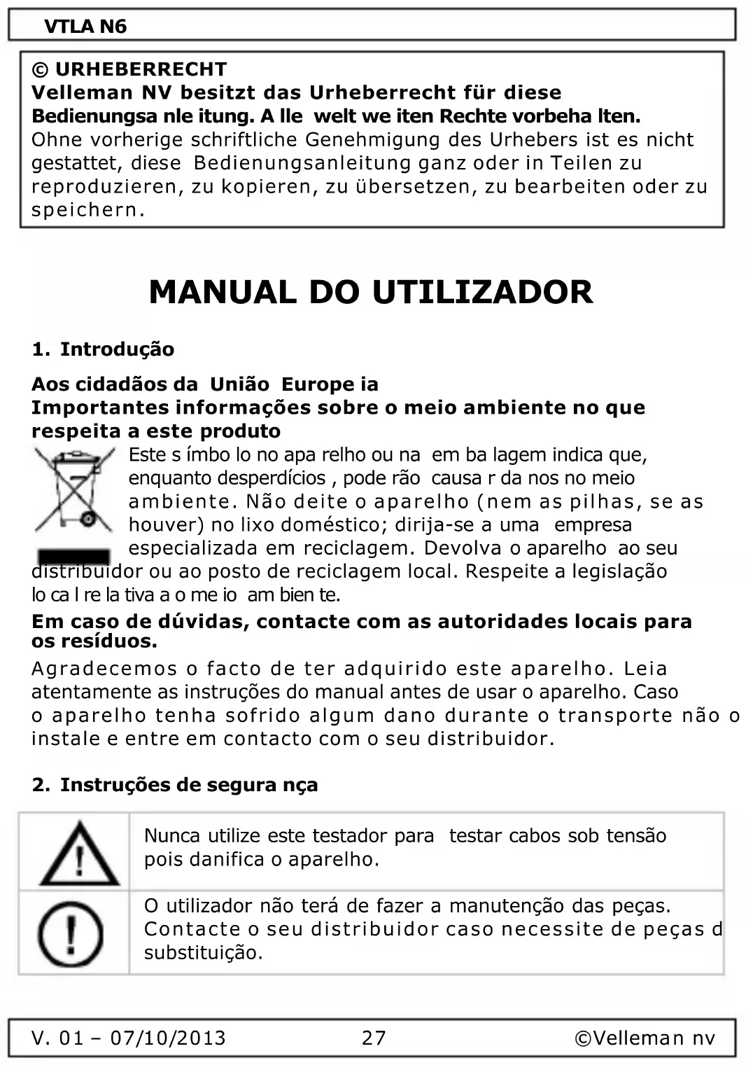 te sta cabos R J-45, 10 Base-T, Token Ring, RJ11/12 alimentação pilha de 9 V 6LR61C (não incl.) comprimento máx. do cabo a te s ta r 100 m Utilize este apare lho ape nas com acess órios o rig ina is. A Velleman NV não será responsável por quaisquer danos ou lesões causados pelo uso (indevido) do aparelho. Para mais informação sobre este produto e para aceder à versão mais recente deste ma nua l do utiliza dor, v isite a nossa pág ina www.velleman.eu. Podem alterar-se as especificações e o conteúdo deste ma nua l sem aviso prévio.VTLA N6