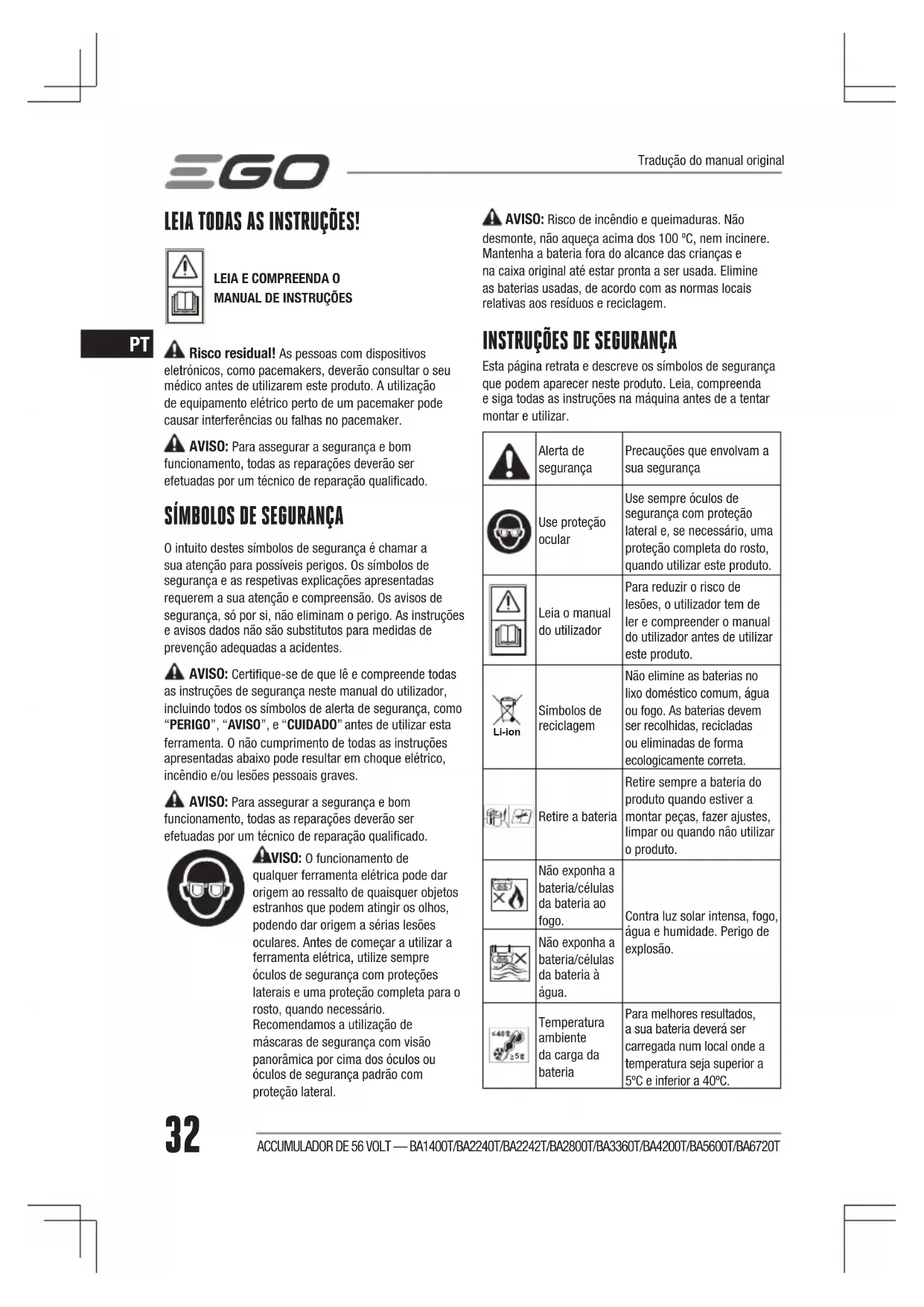 Temperatura ambiente da carga da bateria Para melhores resultados, a sua bateria deverá ser carregada num local onde a temperatura seja superior a 5ºC e inferior a 40ºC. Tradução do manual originalACCUMULADOR DE 56 VOLT — BA1400T/BA2240T/BA2242T/BA2800T/BA3360T/BA4200T/BA5600T/BA6720T