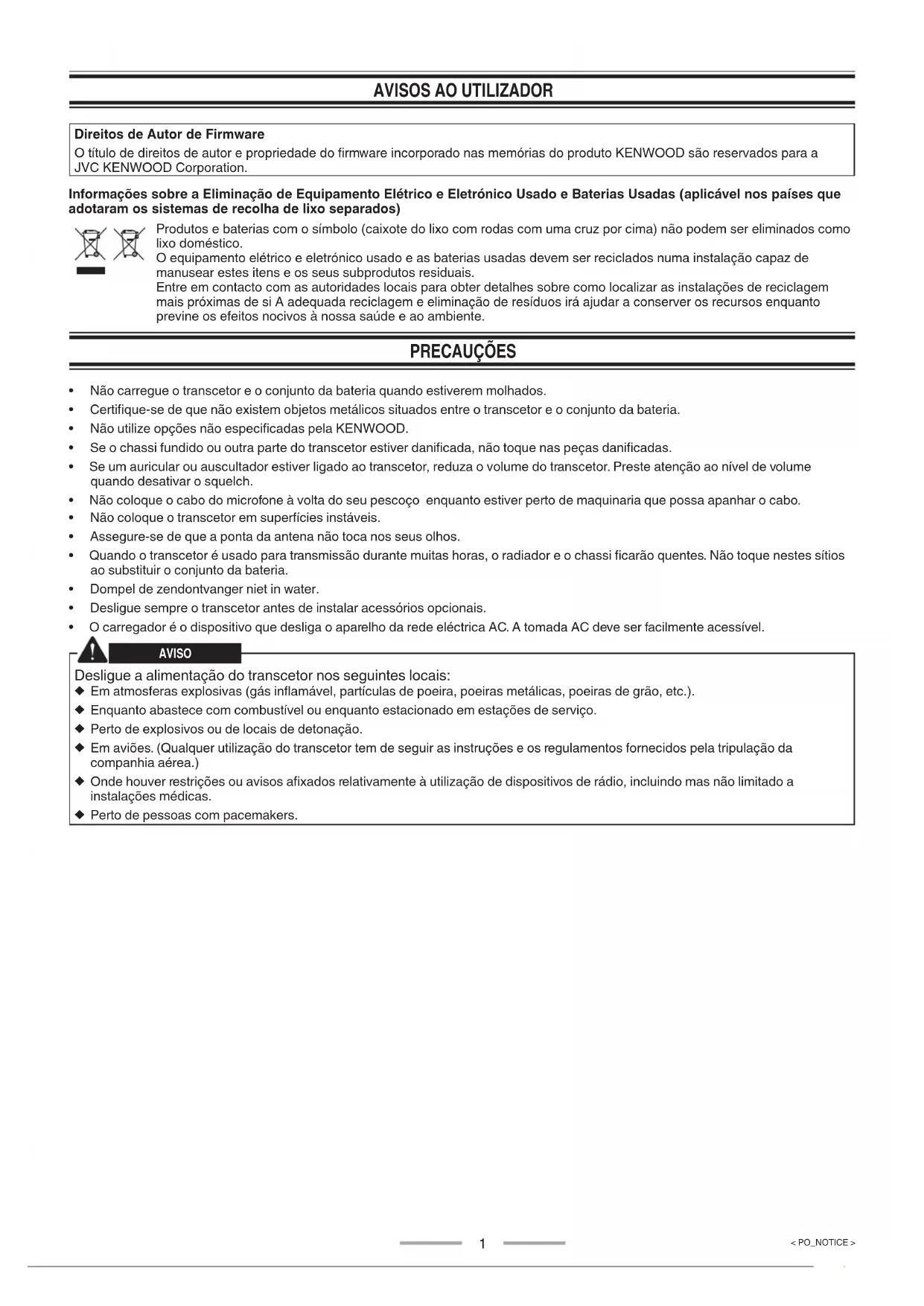 Direitos de Autor de Firmware O título de direitos de autor e propriedade do firmware incorporado nas memórias do produto KENWOOD são reservados para a JVC KENWOOD Corporation. Informações sobre a Eliminação de Equipamento Elétrico e Eletrónico Usado e Baterias Usadas (aplicável nos países que adotaram os sistemas de recolha de lixo separados) Produtos e baterias com o símbolo (caixote do lixo com rodas com uma cruz por cima) não podem ser eliminados como lixo doméstico. O equipamento elétrico e eletrónico usado e as baterias usadas devem ser reciclados numa instalação capaz de manusear estes itens e os seus subprodutos residuais. Entre em contacto com as autoridades locais para obter detalhes sobre como localizar as instalações de reciclagem mais próximas de si A adequada reciclagem e eliminação de resíduos irá ajudar a conserver os recursos enquanto previne os efeitos nocivos à nossa saúde e ao ambiente. PRECAUÇÕES