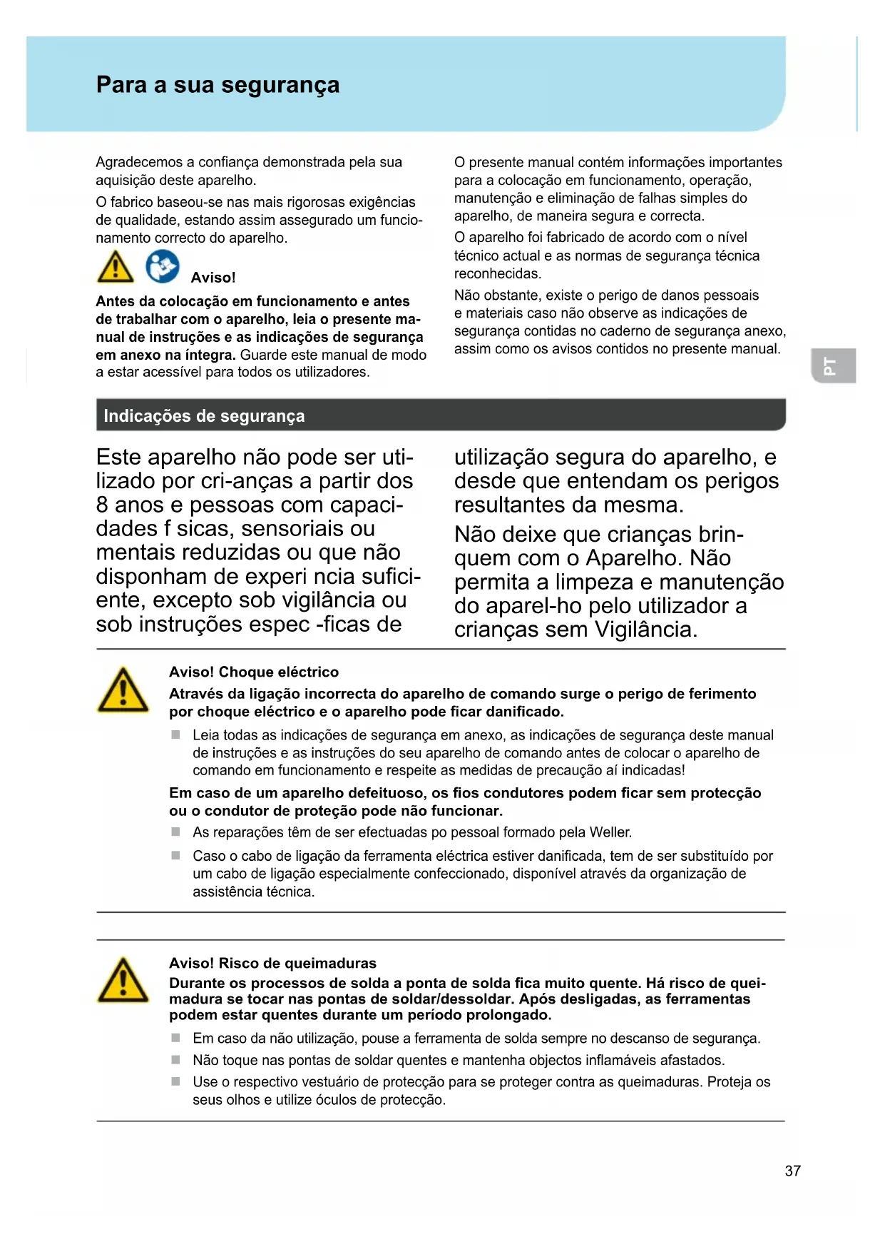 Para a sua segurança Agradecemosaconançademonstradapelasua aquisição deste aparelho. O fabrico baseou-se nas mais rigorosas exigências de qualidade, estando assim assegurado um funcio- namento correcto do aparelho. Aviso! Antes da colocação em funcionamento e antes de trabalhar com o aparelho, leia o presente ma- nual de instruções e as indicações de segurança em anexo na íntegra. Guardeestemanualdemodo aestaracessívelparatodososutilizadores. O presente manual contém informações importantes para a colocação em funcionamento, operação, manutenção e eliminação de falhas simples do aparelho, de maneira segura e correcta. Oaparelhofoifabricadodeacordocomonível técnico actual e as normas de segurança técnica reconhecidas. Não obstante, existe o perigo de danos pessoais e materiais caso não observe as indicações de segurança contidas no caderno de segurança anexo, assim como os avisos contidos no presente manual. Indicações de segurança Este aparelho não pode ser uti- lizado por cri-anças a partir dos 8 anos e pessoas com capaci- dades f sicas, sensoriais ou mentais reduzidas ou que não disponhamdeexperinciasuci- ente, excepto sob vigilância ou sobinstruçõesespec-casde utilização segura do aparelho, e desde que entendam os perigos resultantes da mesma. Não deixe que crianças brin- quem com o Aparelho. Não permita a limpeza e manutenção do aparel-ho pelo utilizador a crianças sem Vigilância. Aviso! Choque eléctrico Através da ligação incorrecta do aparelho de comando surge o perigo de ferimento por choque eléctrico e o aparelho pode car danicado. Leia todas as indicações de segurança em anexo, as indicações de segurança deste manual de instruções e as instruções do seu aparelho de comando antes de colocar o aparelho de comandoemfuncionamentoerespeiteasmedidasdeprecauçãoaíindicadas! Em caso de um aparelho defeituoso, os os condutores podem car sem protecção ou o condutor de proteção pode não funcionar. As reparações têm de ser efectuadas po pessoal formado pela Weller. Casoocabodeligaçãodaferramentaeléctricaestiverdanicada,temdesersubstituídopor umcabodeligaçãoespecialmenteconfeccionado,disponívelatravésdaorganizaçãode assistência técnica. Aviso! Risco de queimaduras Durante os processos de solda a ponta de solda ca muito quente. Há risco de quei- madura se tocar nas pontas de soldar/dessoldar. Após desligadas, as ferramentas podem estar quentes durante um período prolongado. Em caso da não utilização, pouse a ferramenta de solda sempre no descanso de segurança. Nãotoquenaspontasdesoldarquentesemantenhaobjectosinamáveisafastados. Useorespectivovestuáriodeprotecçãoparaseprotegercontraasqueimaduras.Protejaos seus olhos e utilize óculos de protecção.38