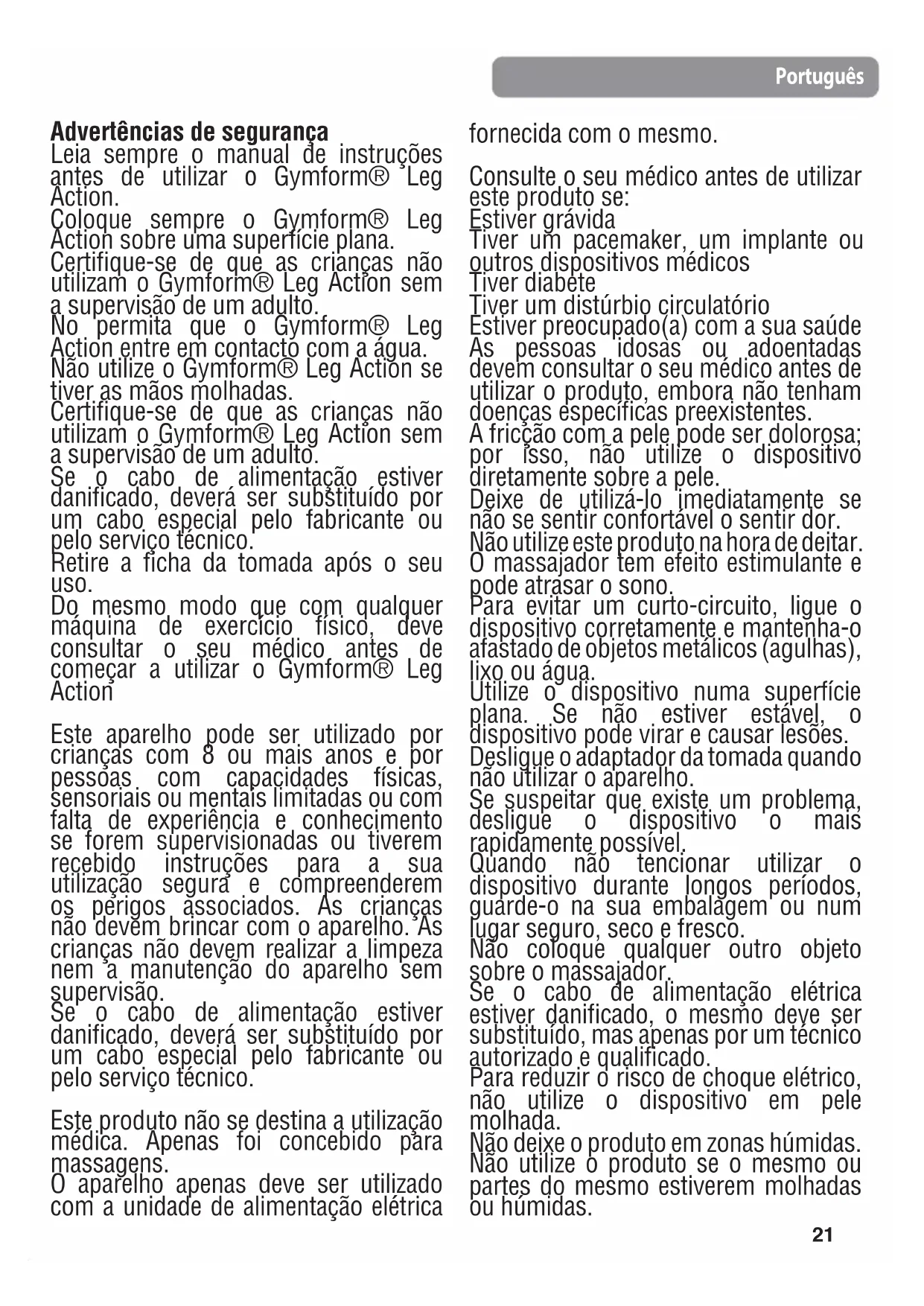 Il simbolo di un contenitore di spazzatura su ruote barrato indica che è necessario conoscere e rispettare le normative e le ordinanze municipali speciche per l’eliminazione di questo tipo di prodotti. Non disfarsi di questo prodotto come se si trattasse di un comune residuo domestico. Seguire le normative e le ordinanze municipali pertinenti. I prodotti elettrici ed elettronici contengono sostanze pericolose che hanno effetti nocivi sull’ambiente e sulla salute umana e devono pertanto essere convenientemente riciclati. Made in China.21 Advertências de segurança Leia sempre o manual de instruções antes de utilizar o Gymform® Leg Action. Coloque sempre o Gymform® Leg Action sobre uma superfície plana. Certifique-se de que as crianças não utilizam o Gymform® Leg Action sem a supervisão de um adulto. No permita que o Gymform® Leg Action entre em contacto com a água. Não utilize o Gymform® Leg Action se tiver as mãos molhadas. Certifique-se de que as crianças não utilizam o Gymform® Leg Action sem a supervisão de um adulto. Se o cabo de alimentação estiver danificado, deverá ser substituído por um cabo especial pelo fabricante ou pelo serviço técnico. Retire a ficha da tomada após o seu uso. Do mesmo modo que com qualquer máquina de exercício físico, deve consultar o seu médico antes de começar a utilizar o Gymform® Leg Action Este aparelho pode ser utilizado por crianças com 8 ou mais anos e por pessoas com capacidades físicas, sensoriais ou mentais limitadas ou com falta de experiência e conhecimento se forem supervisionadas ou tiverem recebido instruções para a sua utilização segura e compreenderem os perigos associados. As crianças não devem brincar com o aparelho. As crianças não devem realizar a limpeza nem a manutenção do aparelho sem supervisão. Se o cabo de alimentação estiver danificado, deverá ser substituído por um cabo especial pelo fabricante ou pelo serviço técnico. Este produto não se destina a utilização médica. Apenas foi concebido para massagens. O aparelho apenas deve ser utilizado com a unidade de alimentação elétrica fornecida com o mesmo. Consulte o seu médico antes de utilizar este produto se: Estiver grávida Tiver um pacemaker, um implante ou outros dispositivos médicos Tiver diabete Tiver um distúrbio circulatório Estiver preocupado(a) com a sua saúde As pessoas idosas ou adoentadas devem consultar o seu médico antes de utilizar o produto, embora não tenham doenças específicas preexistentes. A fricção com a pele pode ser dolorosa; por isso, não utilize o dispositivo diretamente sobre a pele. Deixe de utilizá-lo imediatamente se não se sentir confortável o sentir dor. Não utilize este produto na hora de deitar. O massajador tem efeito estimulante e pode atrasar o sono. Para evitar um curto-circuito, ligue o dispositivo corretamente e mantenha-o afastado de objetos metálicos (agulhas), lixo ou água. Utilize o dispositivo numa superfície plana. Se não estiver estável, o dispositivo pode virar e causar lesões. Desligue o adaptador da tomada quando não utilizar o aparelho. Se suspeitar que existe um problema, desligue o dispositivo o mais rapidamente possível. Quando não tencionar utilizar o dispositivo durante longos períodos, guarde-o na sua embalagem ou num lugar seguro, seco e fresco. Não coloque qualquer outro objeto sobre o massajador. Se o cabo de alimentação elétrica estiver danificado, o mesmo deve ser substituído, mas apenas por um técnico autorizado e qualificado. Para reduzir o risco de choque elétrico, não utilize o dispositivo em pele molhada. Não deixe o produto em zonas húmidas. Não utilize o produto se o mesmo ou partes do mesmo estiverem molhadas ou húmidas. Português22 O dispositivo pode ser utilizado por crianças de 8 anos, ou por pessoas com capacidades físicas, sensoriais ou mentais reduzidas ou com falta de experiência e/ou conhecimentos, se tiverem sido supervisionadas ou instruídas em relação à utilização segura do dispositivo e estiverem cientes dos riscos associados ao seu uso. As crianças não devem brincar com o aparelho. As crianças não devem realizar tarefas de limpeza e manutenção a não ser que tenham mais de 8 anos de idade e sejam supervisionadas. As crianças de menos de 8 anos devem estar afastadas do dispositivo e do cabo de alimentação elétrica. Para evitar lesões e danos irreparáveis, esteja sempre sentado quando utilizar o massajador. A fim de evitar lesões perigosas, nunca esteja de pé sobre a unidade nem utilize energicamente a mesma. Não tente desmontar ou reparar o produto. As reparações apenas podem ser efetuadas por técnicos adequadamente qualificados. Descrição do produto: