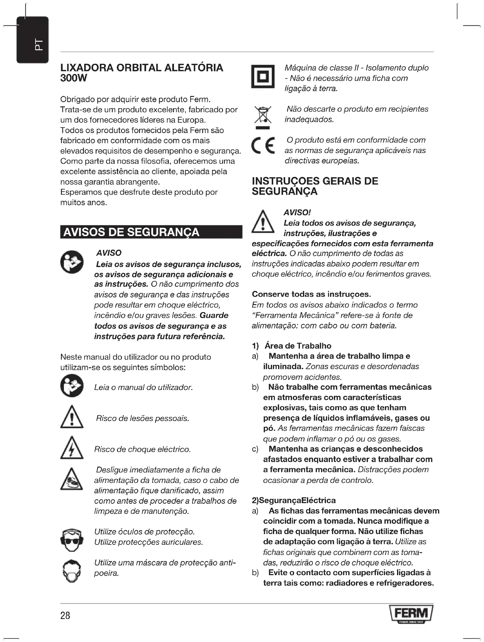 300W Obrigado por adquirir este produto Ferm. Trata-se de um produto excelente, fabricado por um dos fornecedores líderes na Europa. Todos os produtos fornecidos pela Ferm são fabricado em conformidade com os mais elevados requisitos de desempenho e segurança. Como parte da nossa filosofia, oferecemos uma excelente assistência ao cliente, apoiada pela nossa garantia abrangente. Esperamos que desfrute deste produto por muitos anos.