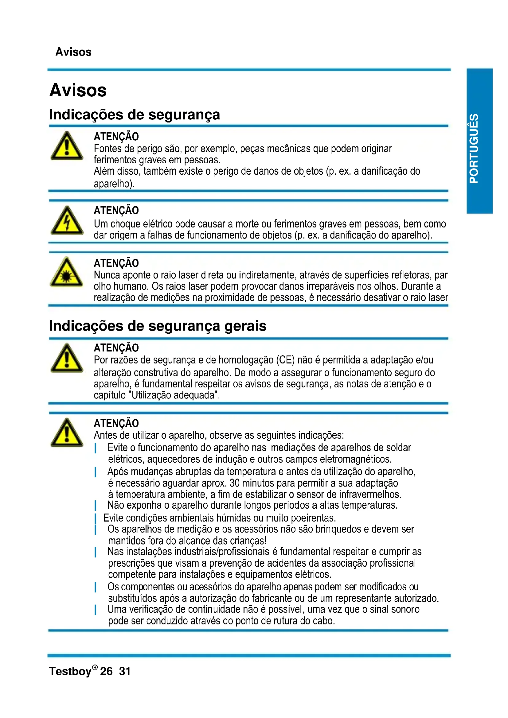 ATENÇÃO Antes de utilizar o aparelho, observe as seguintes indicações: | Evite o funcionamento do aparelho nas imediações de aparelhos de soldar elétricos, aquecedores de indução e outros campos eletromagnéticos. | Após mudanças abruptas da temperatura e antes da utilização do aparelho, é necessário aguardar aprox. 30 minutos para permitir a sua adaptação à temperatura ambiente, a fim de estabilizar o sensor de infravermelhos. | Não exponha o aparelho durante longos períodos a altas temperaturas. | Evite condições ambientais húmidas ou muito poeirentas. | Os aparelhos de medição e os acessórios não são brinquedos e devem ser mantidos fora do alcance das crianças! | Nas instalações industriais/profissionais é fundamental respeitar e cumprir as prescrições que visam a prevenção de acidentes da associação profissional competente para instalações e equipamentos elétricos. | Os componentes ou acessórios do aparelho apenas podem ser modificados ou substituídos após a autorização do fabricante ou de um representante autorizado. | Uma verificação de continuidade não é possível, uma vez que o sinal sonoro pode ser conduzido através do ponto de rutura do cabo.Avisos 32 Testboy