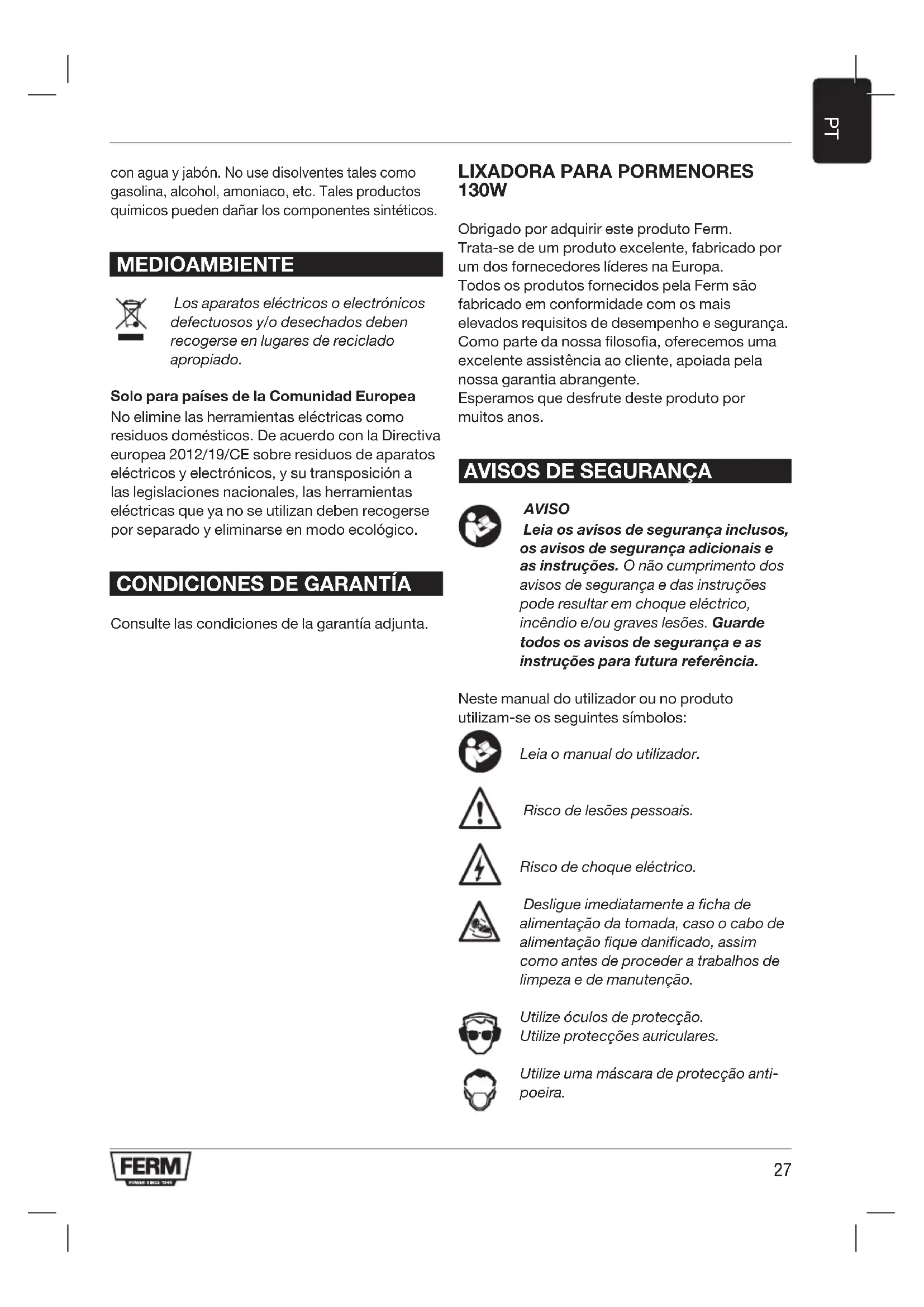 130W Obrigado por adquirir este produto Ferm. Trata-se de um produto excelente, fabricado por um dos fornecedores líderes na Europa. Todos os produtos fornecidos pela Ferm são fabricado em conformidade com os mais elevados requisitos de desempenho e segurança. Como parte da nossa filosofia, oferecemos uma excelente assistência ao cliente, apoiada pela nossa garantia abrangente. Esperamos que desfrute deste produto por muitos anos.