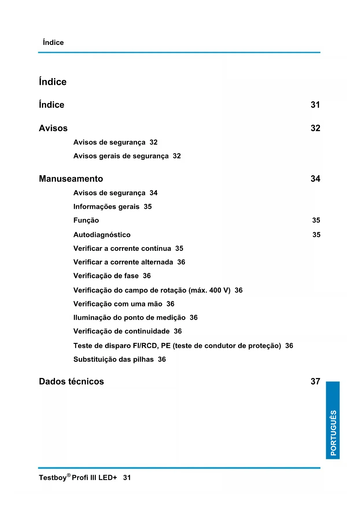Profi III LED+ 31 PORTUGUÊS Índice Índice 31 Avisos 32 Avisos de segurança 32 Avisos gerais de segurança 32 Manuseamento 34 Avisos de segurança 34 Informações gerais 35 Função 35 Autodiagnóstico 35 Verificar a corrente contínua 35 Verificar a corrente alternada 36 Verificação de fase 36 Verificação do campo de rotação (máx. 400 V) 36 Verificação com uma mão 36 Iluminação do ponto de medição 36 Verificação de continuidade 36 Teste de disparo FI/RCD, PE (teste de condutor de proteção) 36 Substituição das pilhas 36 Dados técnicos 37Avisos 32 Testboy