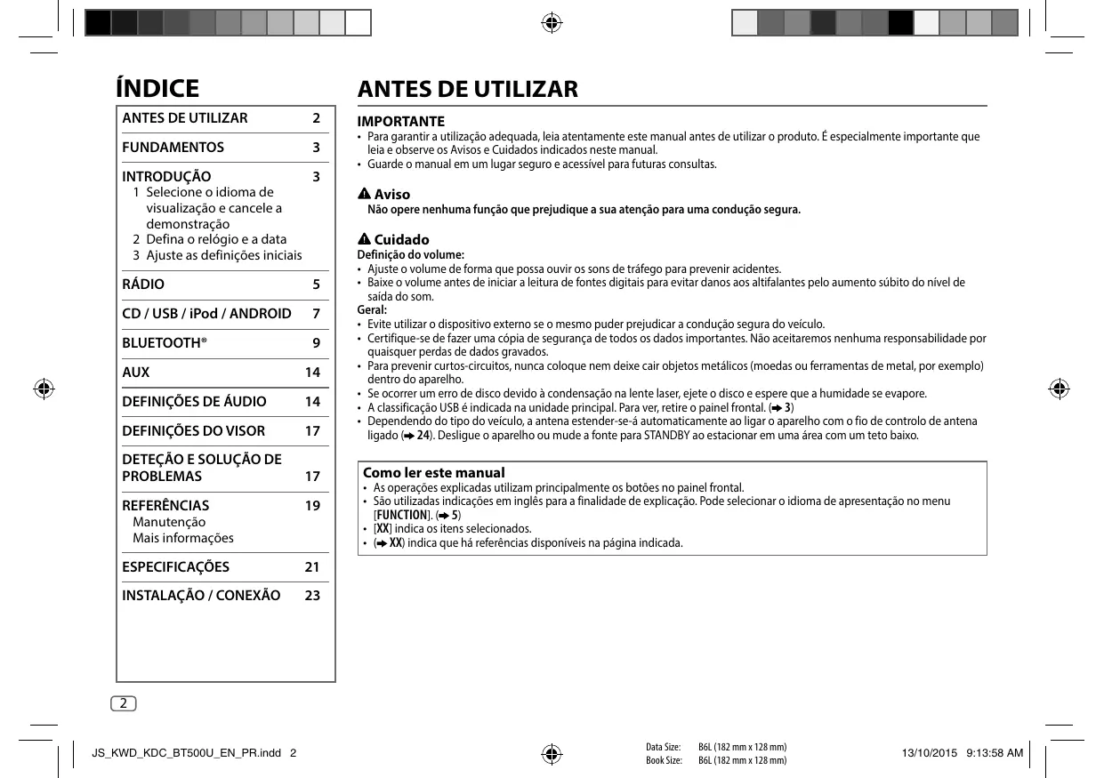 - Dependo do idioma de apresentação selecionado ( 5), alguns caracteres podem não ser corretamente apresentados. PORTUGUÊS JS_KWD_KDC_BT500U_EN_PR.indd 17 Data Size: Book Size: B6L (182 mm x 128 mm) B6L (182 mm x 128 mm)