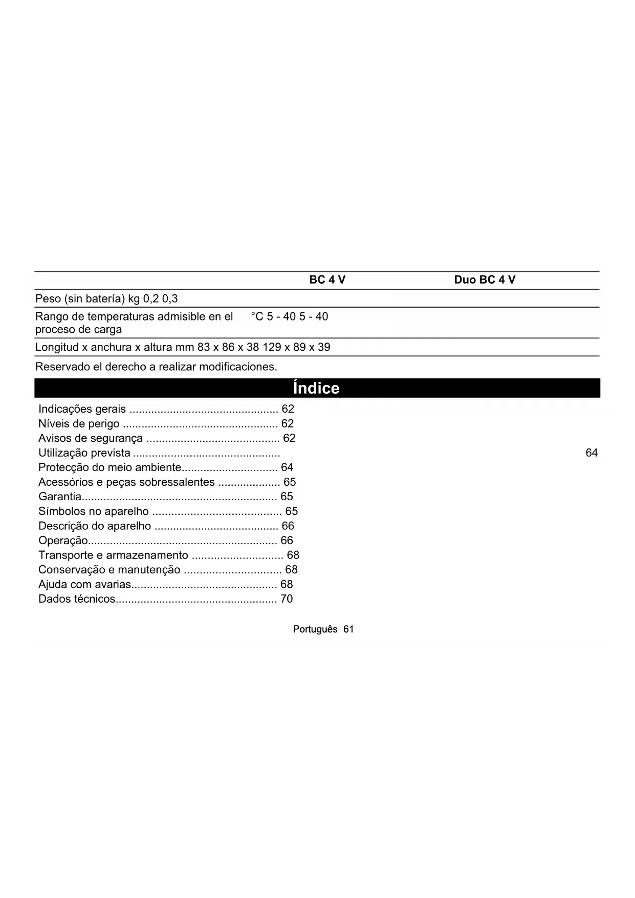 • a Desenchufe la fuente de alimentación de red. b Retire la batería del cargador. c Póngase en contacto con nuestro servicio de postventa o un socio de servicio técnico. Puede encontrar a su persona de contacto en: www.kaercher.com Datos técnicos BC 4 V Duo BC 4 V Conexión eléctrica Tensión nominal de la batería V 3,6 - 3,7 3,6 - 3,7 Corriente de carga máx. A 1,0 2 x 2,5 Tipo de batería Li-ION (BP 4 V) Li-ION (BP 4 V) Plataforma de la batería Battery Power 4 V Battery Power 4 V Tensión de red V 100 - 240 100 - 240 Frecuencia Hz 50 - 60 50 - 60 Consumo de corriente A 0,2 0,6 Clase de protección II II Peso y dimensionesPortuguês 61 Reservado el derecho a realizar modificaciones. Índice Peso (sin batería) kg 0,2 0,3 Rango de temperaturas admisible en el proceso de carga °C 5 - 40 5 - 40 Longitud x anchura x altura mm 83 x 86 x 38 129 x 89 x 39 Indicações gerais p. 62