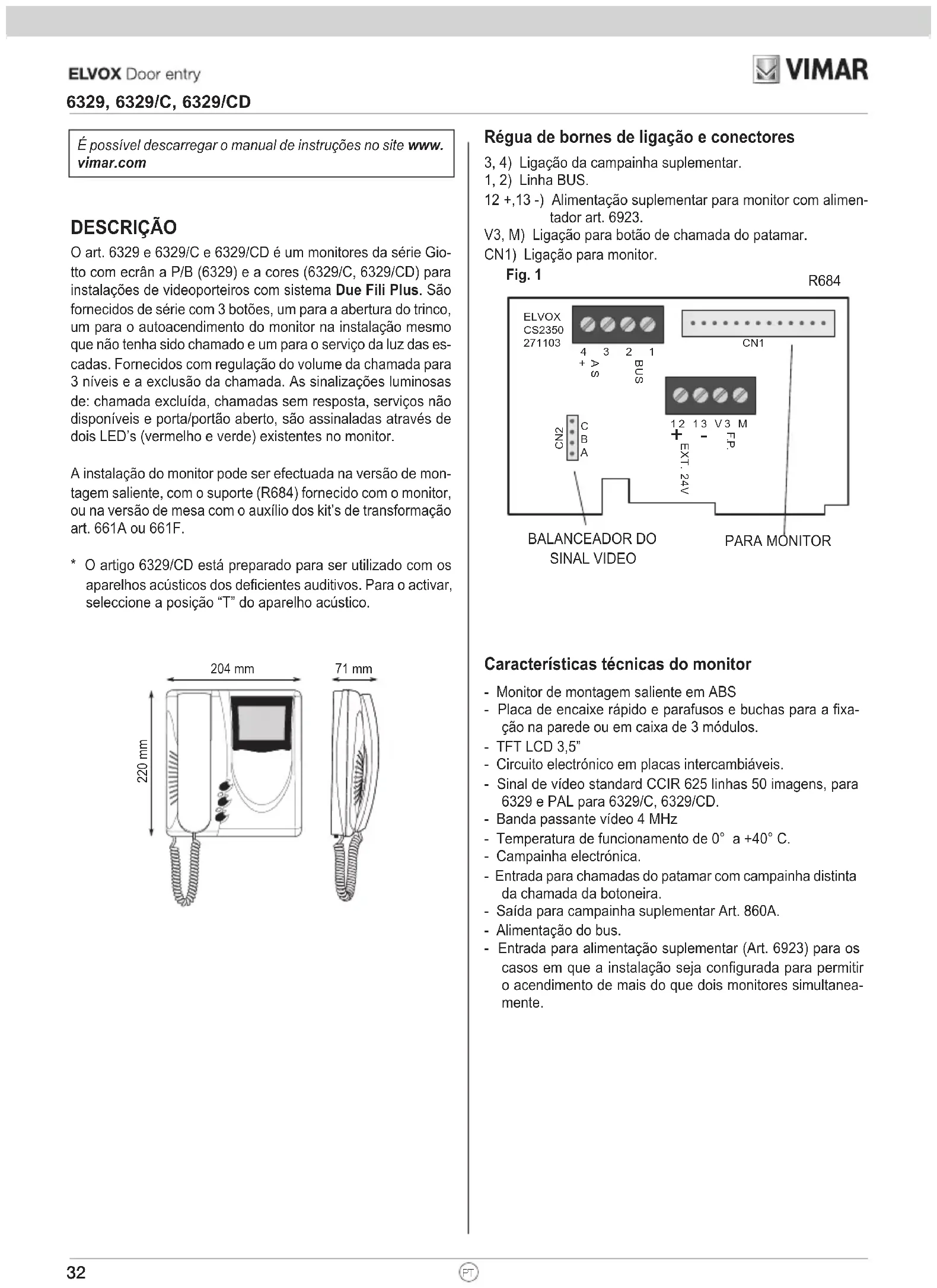 6329, 6329/C, 6329/CDFig. 1 Características técnicas do monitor - Monitor de montagem saliente em ABS - Placa de encaixe rápido e parafusos e buchas para a fixa- ção na parede ou em caixa de 3 módulos. - TFT LCD 3,5” - Circuito electrónico em placas intercambiáveis. - Sinal de vídeo standard CCIR 625 linhas 50 imagens, para 6329 e PAL para 6329/C, 6329/CD. - Banda passante vídeo 4 MHz - Temperatura de funcionamento de 0° a +40° C. - Campainha electrónica. - Entrada para chamadas do patamar com campainha distinta da chamada da botoneira. - Saída para campainha suplementar Art. 860A. - Alimentação do bus. - Entrada para alimentação suplementar (Art. 6923) para os casos em que a instalação seja configurada para permitir o acendimento de mais do que dois monitores simultanea- mente. DESCRIÇÃO O art. 6329 e 6329/C e 6329/CD é um monitores da série Gio- tto com ecrân a P/B (6329) e a cores (6329/C, 6329/CD) para instalações de videoporteiros com sistema Due Fili Plus. São fornecidos de série com 3 botões, um para a abertura do trinco, um para o autoacendimento do monitor na instalação mesmo que não tenha sido chamado e um para o serviço da luz das es- cadas. Fornecidos com regulação do volume da chamada para 3 níveis e a exclusão da chamada. As sinalizações luminosas de: chamada excluída, chamadas sem resposta, serviços não disponíveis e porta/portão aberto, são assinaladas através de dois LED’s (vermelho e verde) existentes no monitor. A instalação do monitor pode ser efectuada na versão de mon- tagem saliente, com o suporte (R684) fornecido com o monitor, ou na versão de mesa com o auxílio dos kit’s de transformação art. 661A ou 661F.