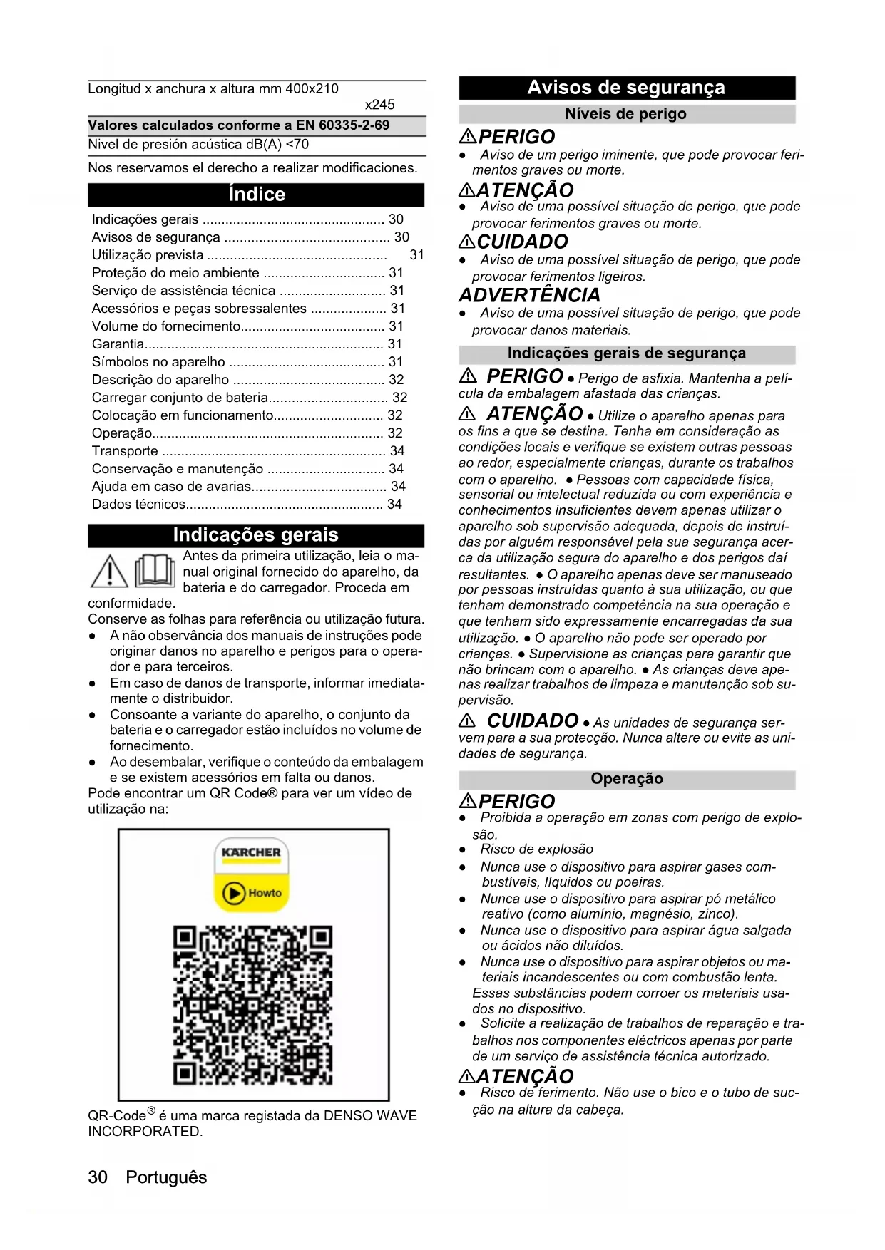 - s fins a que se destina. Tenha em consideração as condições locais e verifique se existem outras pessoas ao redor, especialmente crianças, durante os trabalhos com o aparelho. ● Pessoas com capacidade física, sensorial ou intelectual reduzida ou com experiência e conhecimentos insuficientes devem apenas utilizar o aparelho sob supervisão adequada, depois de instruí- das por alguém responsável pela sua segurança acer- ca da utilização segura do aparelho e dos perigos daí resultantes. ● O aparelho apenas deve ser manuseado por pessoas instruídas quanto à sua utilização, ou que tenham demonstrado competência na sua operação e que tenham sido expressamente encarregadas da sua utilização. ● O aparelho não pode ser operado por crianças. ● Supervisione as crianças para garantir que não brincam com o aparelho. ● As crianças deve ape- nas realizar trabalhos de limpeza e manutenção sob su- pervisão. 몇 CUIDADO ● As unidades de segurança ser- vem para a sua protecção. Nunca altere ou evite as uni- dades de segurança. Operação PERIGO ● Proibida a operação em zonas com perigo de explo- são. ● Risco de explosão ● Nunca use o dispositivo para aspirar gases com- bustíveis, líquidos ou poeiras. ● Nunca use o dispositivo para aspirar pó metálico reativo (como alumínio, magnésio, zinco). ● Nunca use o dispositivo para aspirar água salgada ou ácidos não diluídos. ● Nunca use o dispositivo para aspirar objetos ou ma- teriais incandescentes ou com combustão lenta. Essas substâncias podem corroer os materiais usa- dos no dispositivo. ● Solicite a realização de trabalhos de reparação e tra- balhos nos componentes eléctricos apenas por parte de um serviço de assistência técnica autorizado. 몇 ATENÇÃO ● Risco de ferimento. Não use o bico e o tubo de suc- ção na altura da cabeça. Longitud x anchura x altura mm 400x210 x245 Valores calculados conforme a EN 60335-2-69 Nivel de presión acústica dB(A) <70 Indicações gerais p. 30