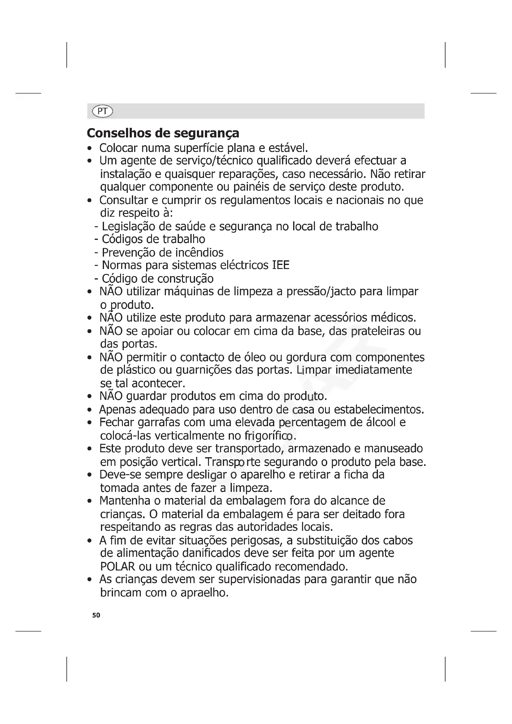 - A fim de evitar situações perigosas, a substituição dos cabos de alimentação danificados deve ser feita por um agente POLAR ou um técnico qualificado recomendado.