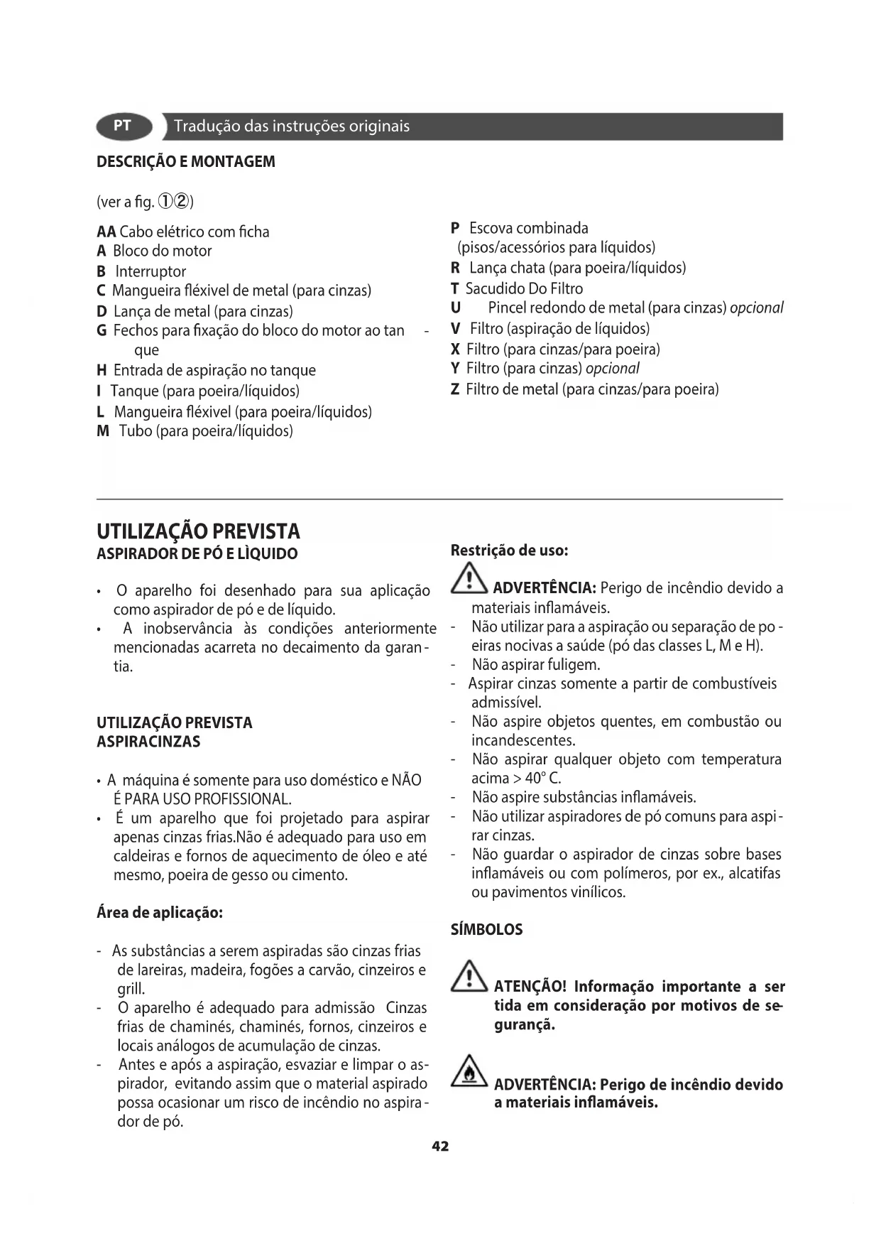 Duplo isolamento (SE PRESENTE): é uma proteção suplementar de isolamento elétrico. Acessórios não são adequados para aspi- ração de cinzas SEGURANÇA