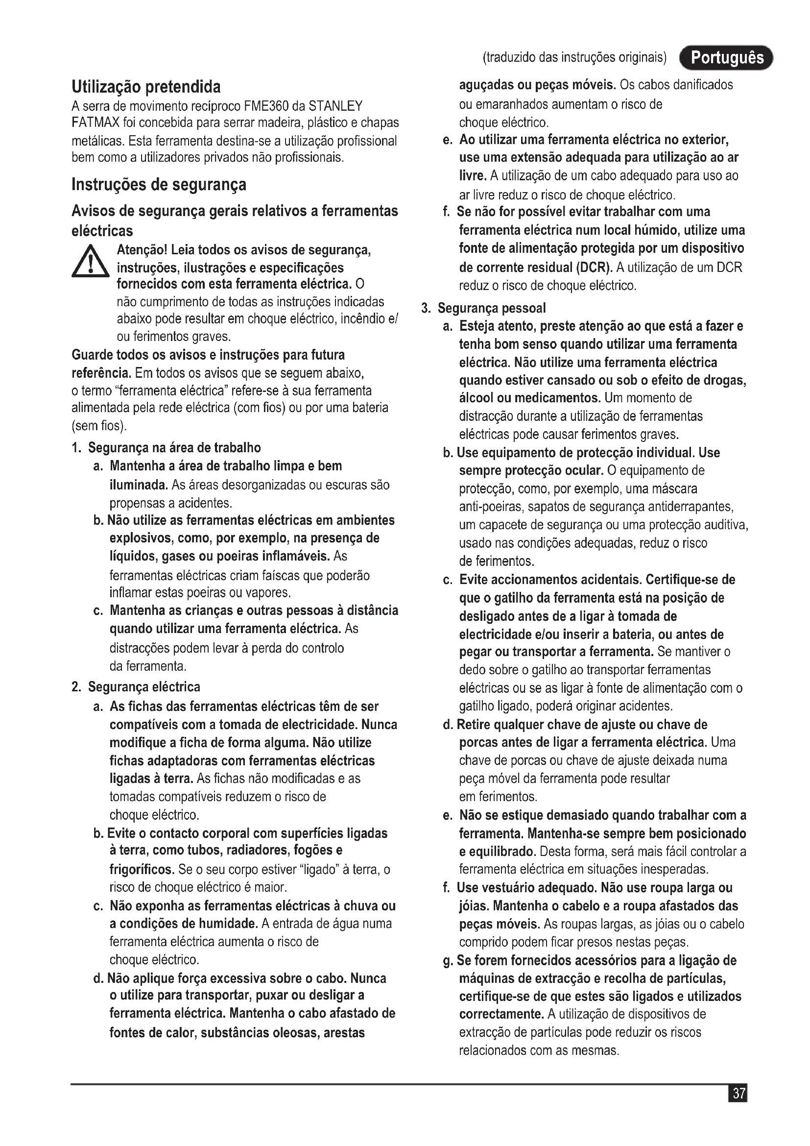 (traduzido das instruções originais) Português (traduzido das instruções originais) Utilização pretendida A serra de movimento recíproco FME360 da STANLEY FATMAX foi concebida para serrar madeira, plástico e chapas metálicas. Esta ferramenta destina-se a utilização prossional bem como a utilizadores privados não prossionais. Instruções de segurança Avisos de segurança gerais relativos a ferramentas eléctricas