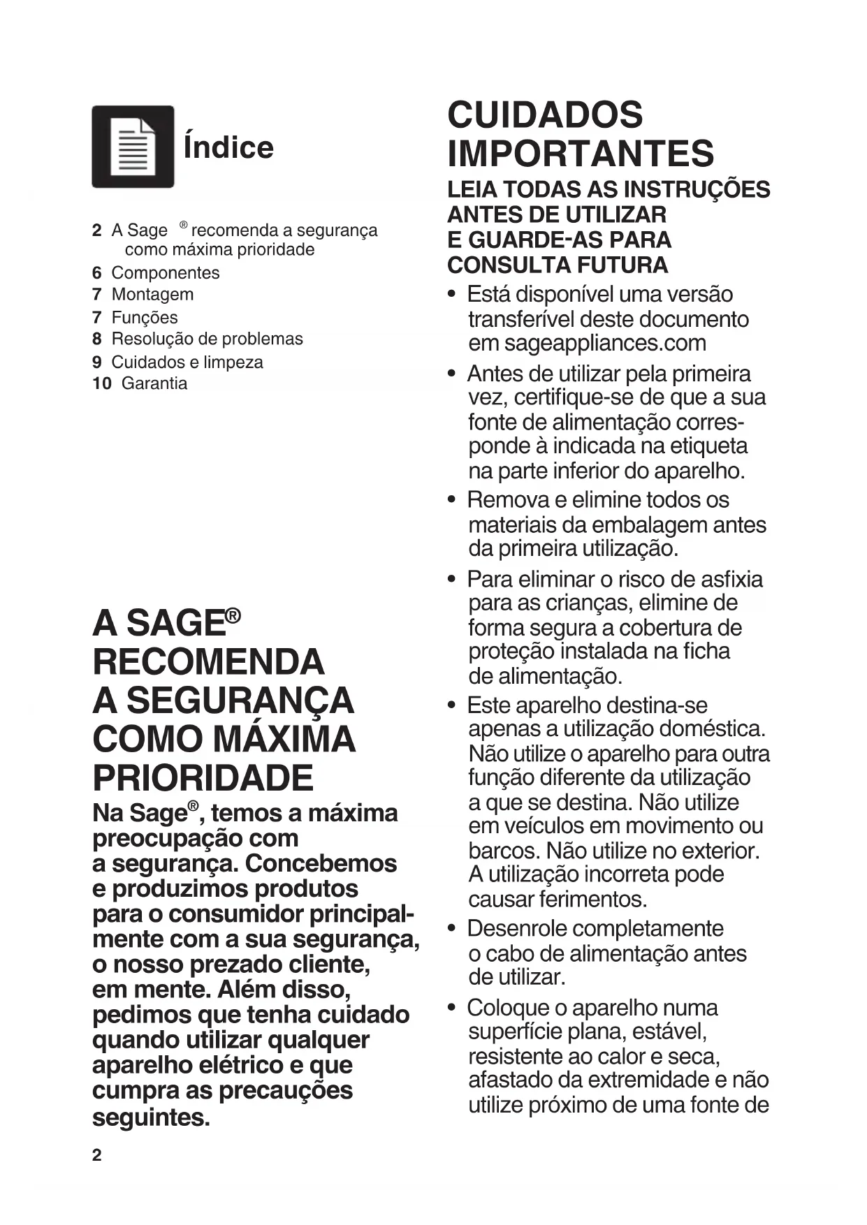 - Coloque o aparelho numa superfície plana, estável, resistente ao calor e seca, afastado da extremidade e não utilize próximo de uma fonte de Índice 2 A Sage recomenda a segurança como máxima prioridade6 Componentes7 Montagem7 Funções8 Resolução de problemas9 Cuidados e limpeza10 Garantia3