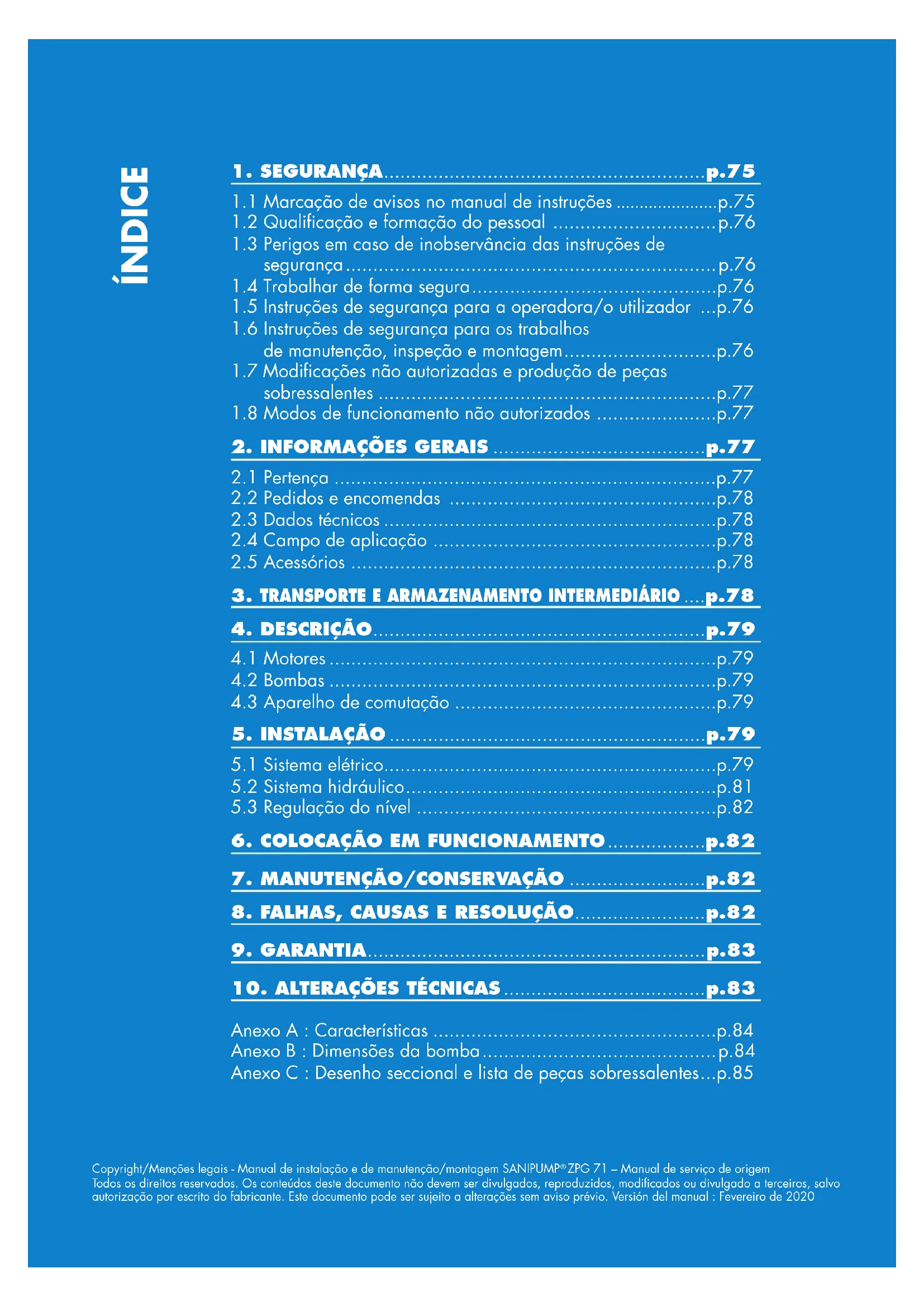 ZPG 71. A inobservância do manual de instruções - em particular das instruções de segu- rança -, assim como a modificação não autorizada do aparelho ou a instalação de peças sobressalentes não originais anula automaticamente a garantia. O fab- ricante não se responsabiliza por quaisquer danos daí resultantes! Como qualquer outro aparelho elétrico, este produto pode falhar devido a uma falta de energia ou a um defeito técnico. Se isso puder causar danos, um gerador de energia de emergência, uma bomba de diafragma manual, um segundo siste- ma (sistema duplo) e/ou um sistema de alarme independente da rede devem ser planeados de acordo com a aplicação. Também após a compra nós estamos à sua disposição como um fabricante para lhe consultar. Em caso de defeitos ou danos, contacte o seu revendedor.78 Produtos : SANIPUMP