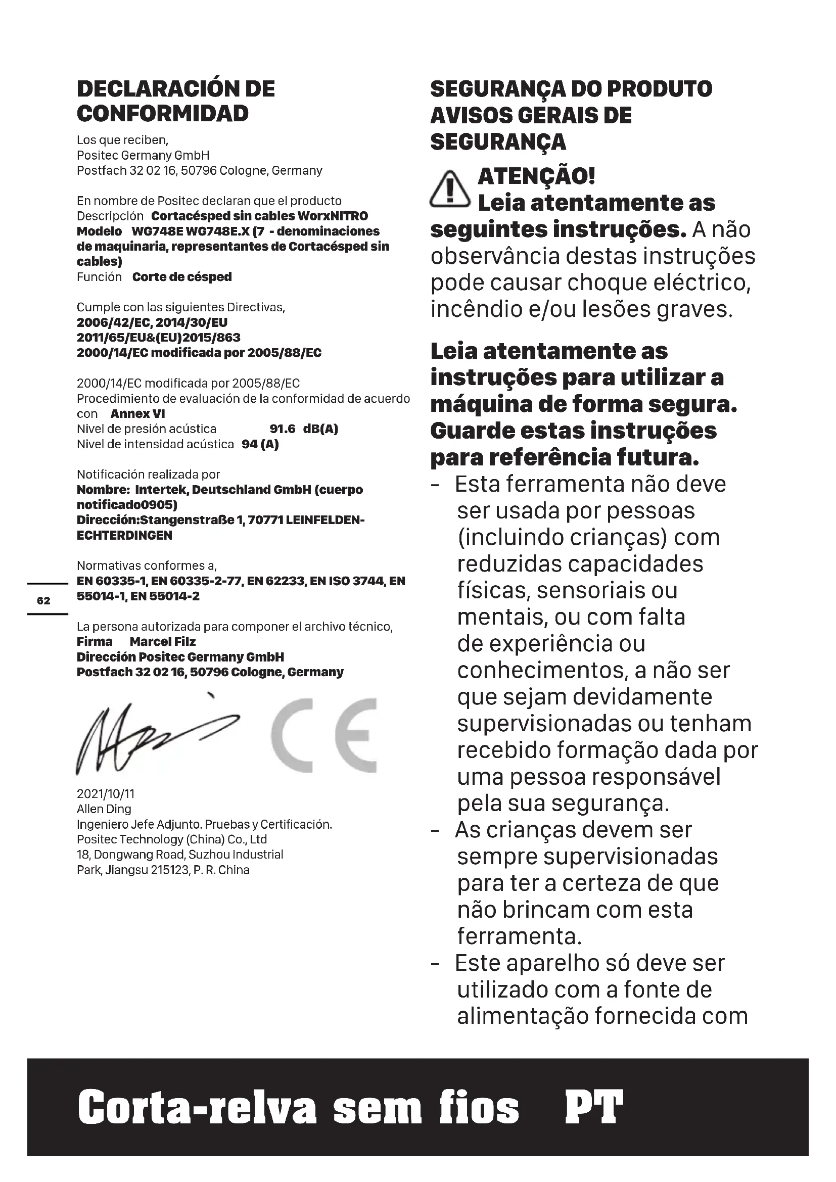 Práticas de utilização segura Treino a) Leia estas instruções atentamente. Familiarize- se com os comandos e a correcta utilização deste equipamento. b) Não deixe que crianças ou quaisquer pessoas não familiarizadas com estas instruções utilizem o equipamento. As regras locais podem impor limites relativamente à idade do operador do equipamento. c) Nunca utilize a máquina, quando estiverem outras pessoas, sobretudo crianças, ou animais nas redondezas. d) O utilizador desta ferramenta é responsável pelos acidentes ou pelas situações de perigo que afectem outras pessoas ou os bens destas. Preparação a) Ao cortar a relva, use sempre calçado forte e calças compridas. Não utilize este equipamento descalço ou com calçado aberto. b) Inspeccione cuidadosamente a área onde vai usar o corta-relva e remova todos os objectos que possam ser lançados pelo mesmo; c) Antes de usar o corta- relva, verifique sempre as lâminas, os parafusos destas e os elementos de corte para se certificar de que estes não estão gastos ou danificados. Substitua os conjuntos de lâminas e de parafusos que estejam gastos ou danificados para que o corta-relva funcione bem. Funcionamento a) Utilize este equipamento apenas durante o dia ou com uma boa luz artificial. b) Sempre que possível, evite utilizar o corta-relva sobre relva molhada. c) Ao trabalhar em superfícies inclinadas certifique-se de que adopta uma posição64 Corta-relva sem fios PT estável. d) Caminhe, não corra; e) Ao usar máquinas com rodas, o corte de relva em terrenos inclinados deve ser feito ao longo da face do terreno e nunca para cima e para baixo; f) Ao trabalhar em locais inclinados, tenha muito cuidado ao mudar de direcção. g) Não proceda a um corte excessivo da relva em locais inclinados. h) Tenha muito cuidado ao virar ou ao puxar o equipamento na sua direcção.