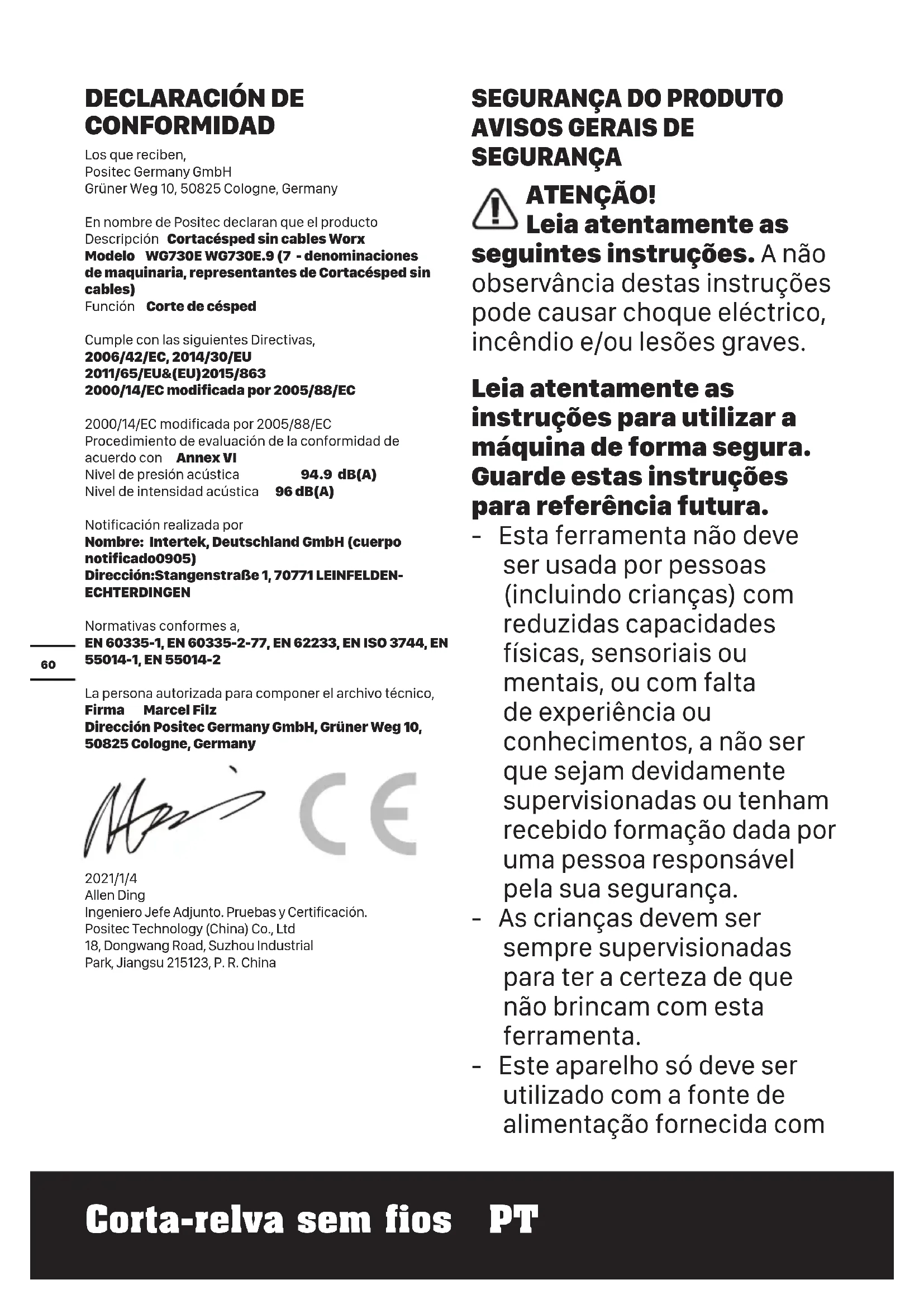 SEGURANÇA ATENÇÃO! Leia atentamente as seguintes instruções. A não observância destas instruções pode causar choque eléctrico, incêndio e/ou lesões graves. Leia atentamente as instruções para utilizar a máquina de forma segura. Guarde estas instruções para referência futura. - Esta ferramenta não deve ser usada por pessoas (incluindo crianças) com reduzidas capacidades físicas, sensoriais ou mentais, ou com falta de experiência ou conhecimentos, a não ser que sejam devidamente supervisionadas ou tenham recebido formação dada por uma pessoa responsável pela sua segurança. - As crianças devem ser sempre supervisionadas para ter a certeza de que não brincam com esta ferramenta. - Este aparelho só deve ser utilizado com a fonte de alimentação fornecida com61 Corta-relva sem fios PT o mesmo. IMPORTANTE LEIA CUIDADOSAMENTE