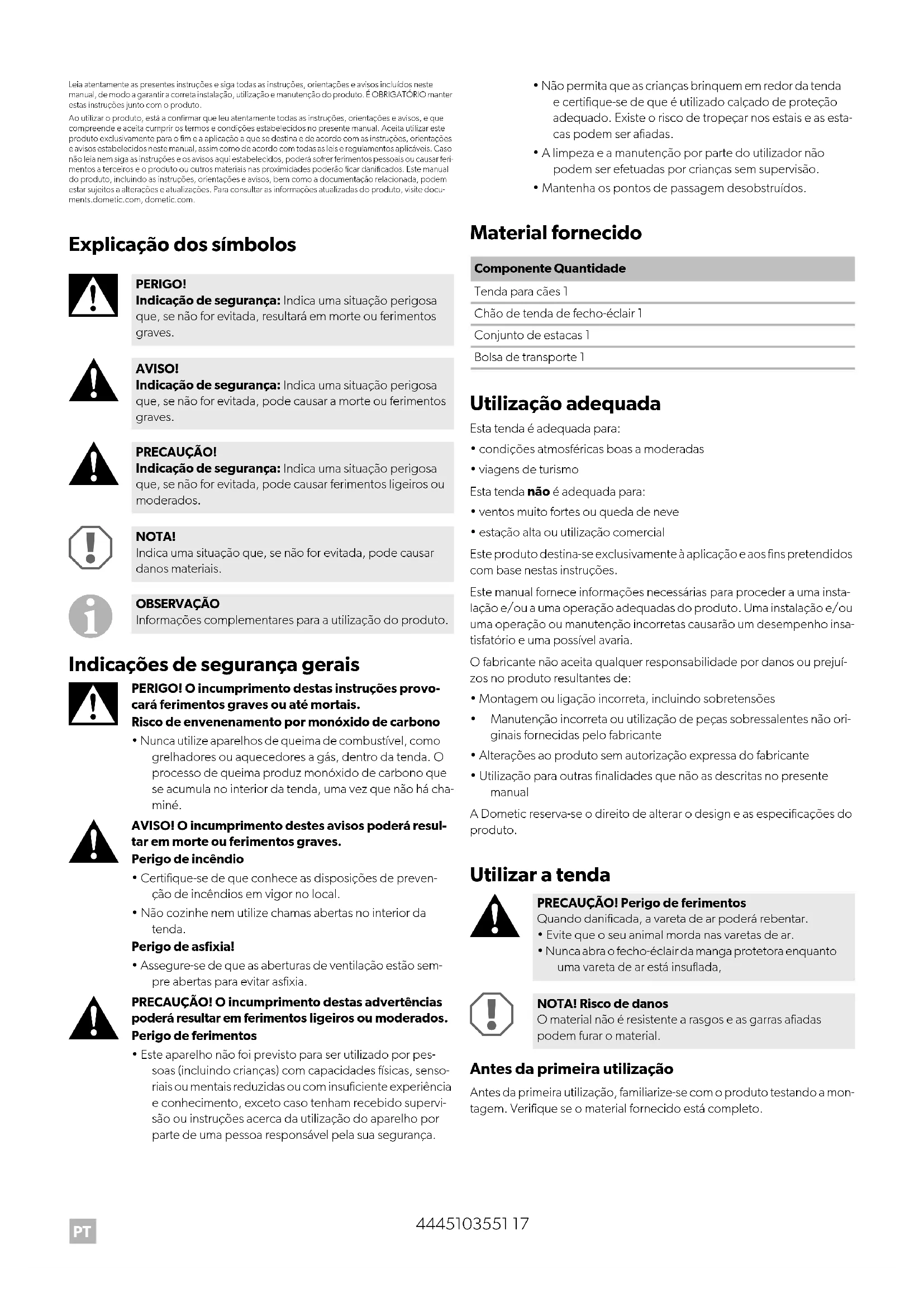 Antes da primeira utilização Antes da primeira utilização, familiarize-se com o produto testando a mon- tagem. Verifique se o material fornecido está completo. PERIGO! Indicação de segurança: Indica uma situação perigosa que, se não for evitada, resultará em morte ou ferimentos graves. AVISO! Indicação de segurança: Indica uma situação perigosa que, se não for evitada, pode causar a morte ou ferimentos graves. PRECAUÇÃO! Indicação de segurança: Indica uma situação perigosa que, se não for evitada, pode causar ferimentos ligeiros ou moderados. NOTA! Indica uma situação que, se não for evitada, pode causar danos materiais. OBSERVAÇÃO Informações complementares para a utilização do produto. Componente Quantidade Tenda para cães 1 Chão de tenda de fecho-éclair 1 Conjunto de estacas 1 Bolsa de transporte 1 PRECAUÇÃO! Perigo de ferimentos Quando danificada, a vareta de ar poderá rebentar.