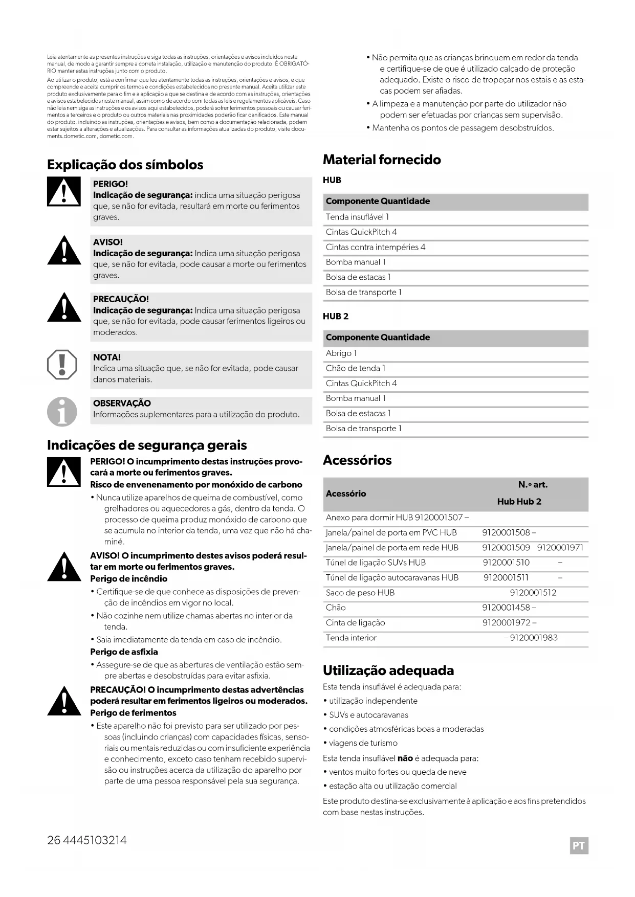 - estação alta ou utilização comercial Este produto destina-se exclusivamente à aplicação e aos fins pretendidos com base nestas instruções. PERIGO! Indicação de segurança: indica uma situação perigosa que, se não for evitada, resultará em morte ou ferimentos graves. AVISO! Indicação de segurança: Indica uma situação perigosa que, se não for evitada, pode causar a morte ou ferimentos graves. PRECAUÇÃO! Indicação de segurança: Indica uma situação perigosa que, se não for evitada, pode causar ferimentos ligeiros ou moderados. NOTA! Indica uma situação que, se não for evitada, pode causar danos materiais. OBSERVAÇÃO Informações suplementares para a utilização do produto. Componente Quantidade Tenda insuflável 1 Cintas QuickPitch 4 Cintas contra intempéries 4 Bomba manual 1 Bolsa de estacas 1 Bolsa de transporte 1 Componente Quantidade Abrigo 1 Chão de tenda 1 Cintas QuickPitch 4 Bomba manual 1 Bolsa de estacas 1 Bolsa de transporte 1 Acessório N.º art. Hub Hub 2 Anexo para dormir HUB 9120001507 – Janela/painel de porta em PVC HUB 9120001508 – Janela/painel de porta em rede HUB 9120001509 9120001971 Túnel de ligação SUVs HUB 9120001510 – Túnel de ligação autocaravanas HUB 9120001511 – Saco de peso HUB 9120001512 Chão 9120001458 – Cinta de ligação 9120001972 – Tenda interior – 9120001983PT