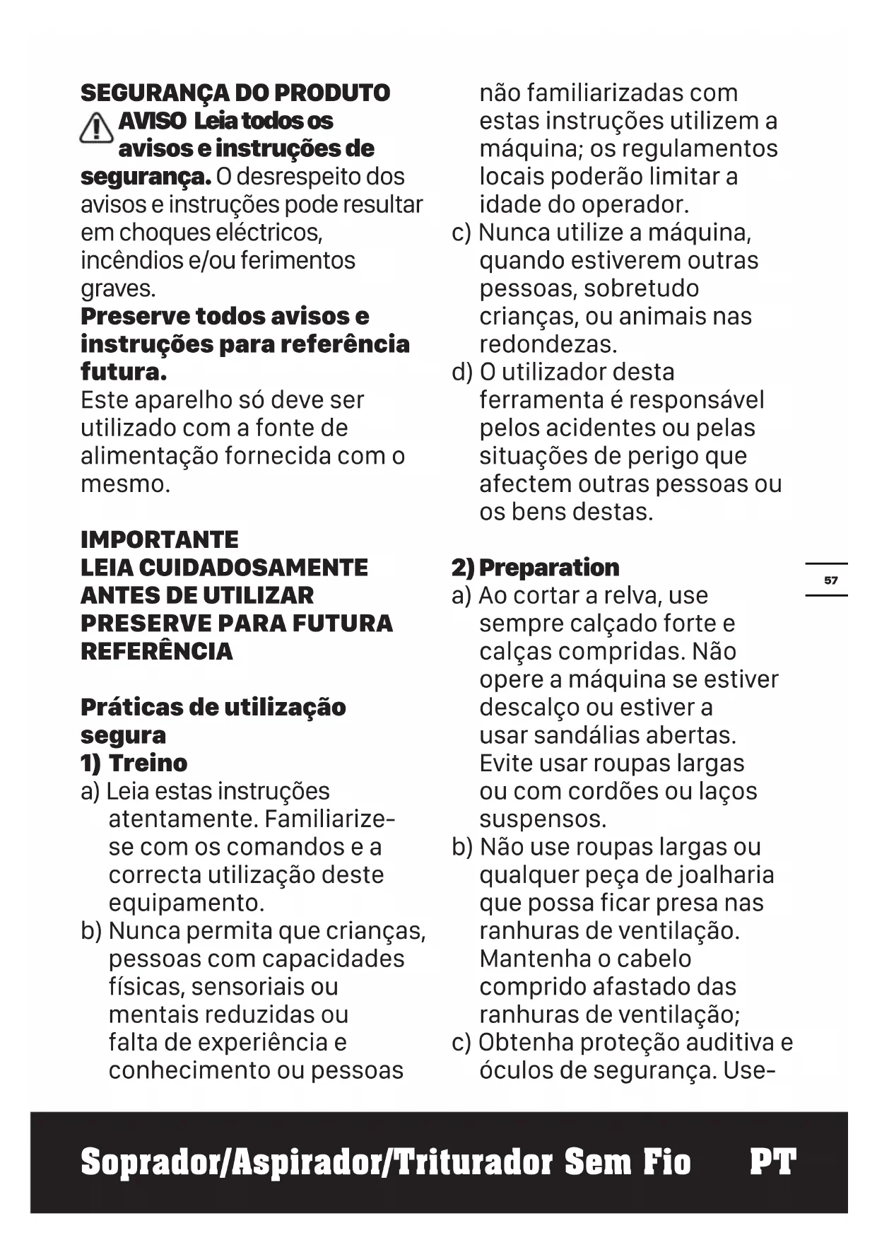 a) Ao cortar a relva, use sempre calçado forte e calças compridas. Não opere a máquina se estiver descalço ou estiver a usar sandálias abertas. Evite usar roupas largas ou com cordões ou laços suspensos. b) Não use roupas largas ou qualquer peça de joalharia que possa ficar presa nas ranhuras de ventilação. Mantenha o cabelo comprido afastado das ranhuras de ventilação; c) Obtenha proteção auditiva e óculos de segurança. Use-58 Soprador/Aspirador/Triturador Sem Fio