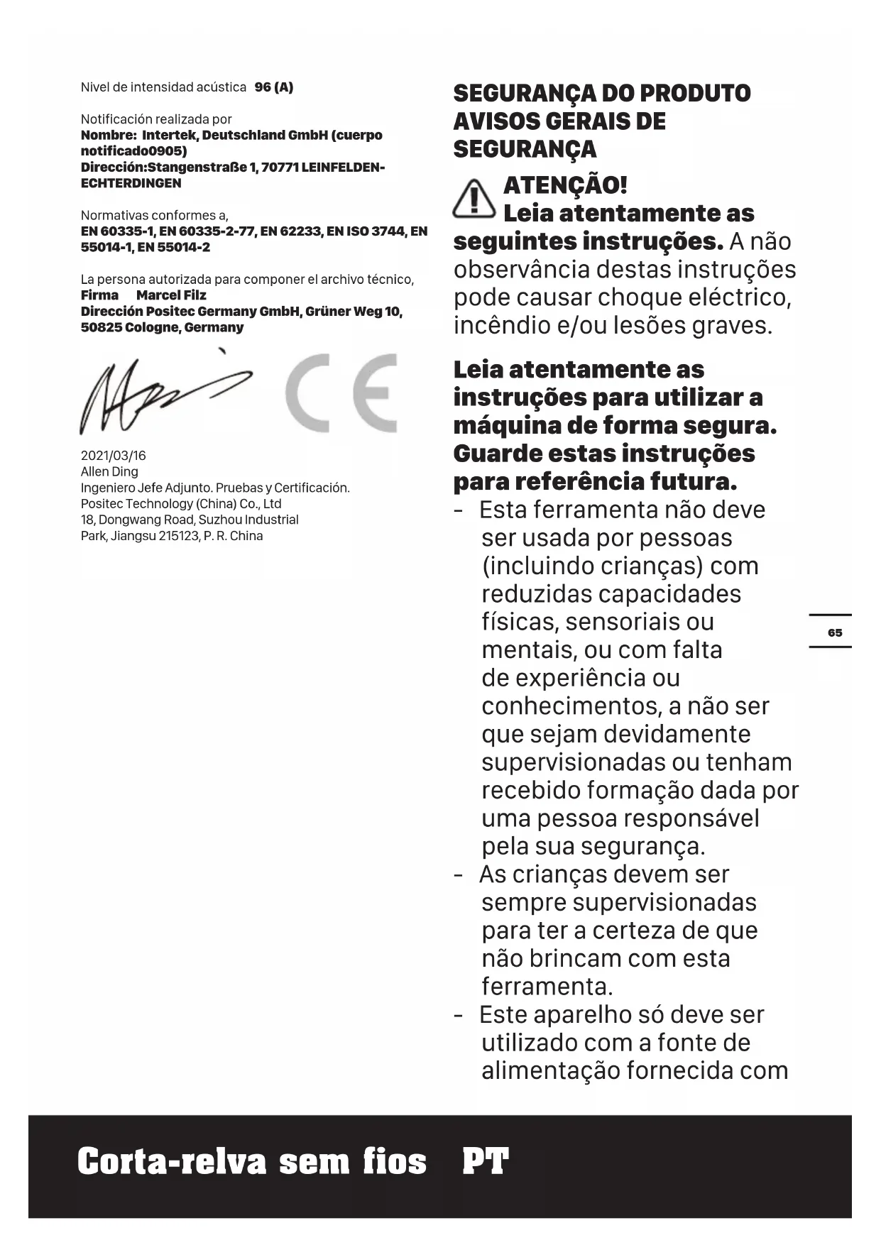 SEGURANÇA ATENÇÃO! Leia atentamente as seguintes instruções. A não observância destas instruções pode causar choque eléctrico, incêndio e/ou lesões graves. Leia atentamente as instruções para utilizar a máquina de forma segura. Guarde estas instruções para referência futura. - Esta ferramenta não deve ser usada por pessoas (incluindo crianças) com reduzidas capacidades físicas, sensoriais ou mentais, ou com falta de experiência ou conhecimentos, a não ser que sejam devidamente supervisionadas ou tenham recebido formação dada por uma pessoa responsável pela sua segurança. - As crianças devem ser sempre supervisionadas para ter a certeza de que não brincam com esta ferramenta. - Este aparelho só deve ser utilizado com a fonte de alimentação fornecida com Nivel de intensidad acústica 96 (A) Notificación realizada por Nombre: Intertek, Deutschland GmbH (cuerpo notificado0905) Dirección:Stangenstraße 1, 70771 LEINFELDEN- ECHTERDINGEN Normativas conformes a, EN 60335-1, EN 60335-2-77, EN 62233, EN ISO 3744, EN 55014-1, EN 55014-2 La persona autorizada para componer el archivo técnico, Firma Marcel Filz Dirección Positec Germany GmbH, Grüner Weg 10, 50825 Cologne, Germany 2021/03/16 Allen Ding Ingeniero Jefe Adjunto. Pruebas y Certificación. Positec Technology (China) Co., Ltd 18, Dongwang Road, Suzhou Industrial Park, Jiangsu 215123, P. R. China66 Corta-relva sem fios PT o mesmo. IMPORTANTE LEIA CUIDADOSAMENTE