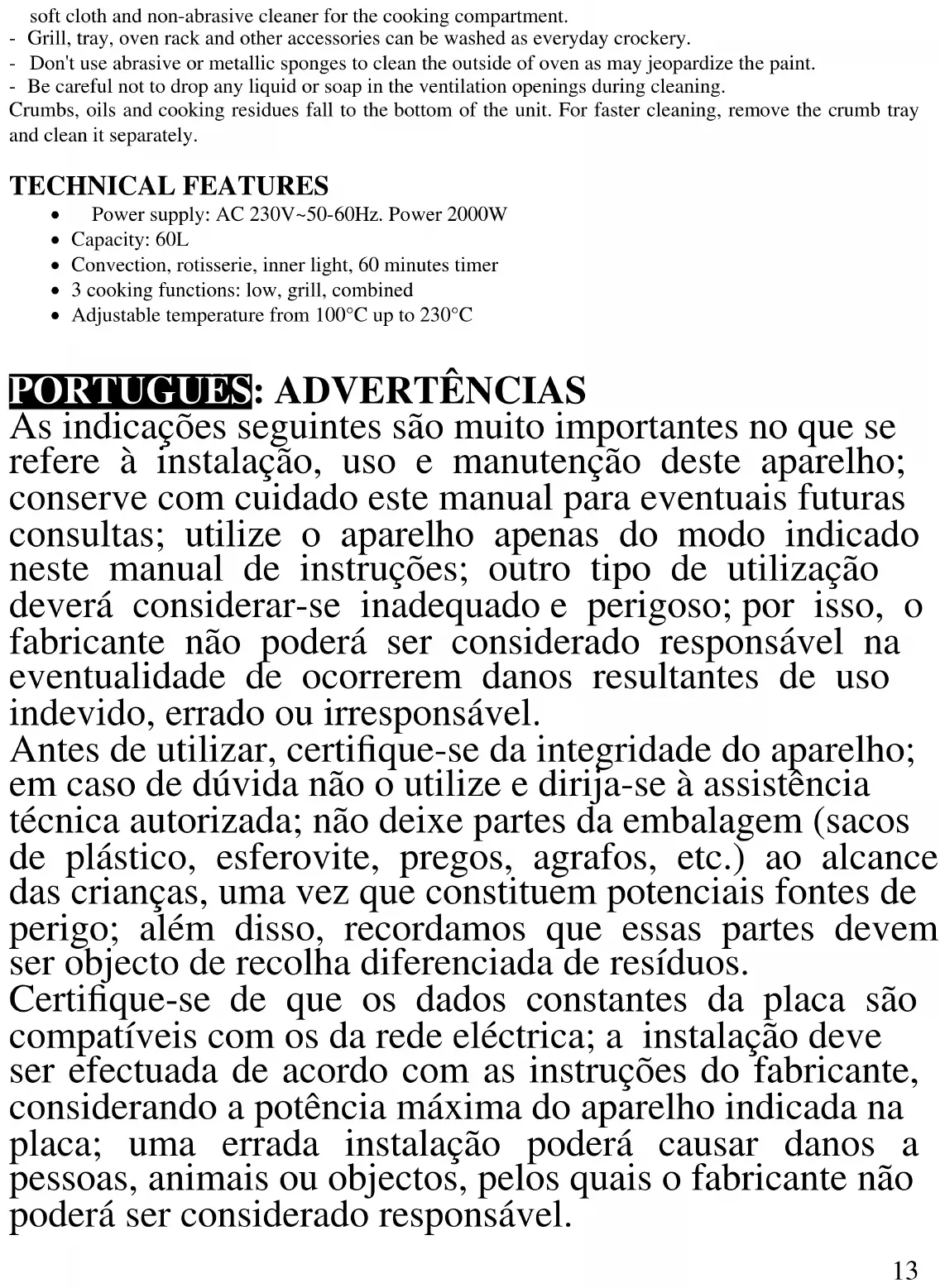 Com o selector funções (3) é possível seleccionar somente resistência inferior, superior ou ambas Posição 1: Liga a resistência superior (cozedura a GRILL) e o espeto Posição 2: Liga a resistência inferior Posição 3 (Grelhados) : Liga a resistência superior e inferior. Posição 4 (assados) : Liga a resistência superior e a ventilação Posição 5: Liga a resistência inferior e a ventilação Posição 6 (assados) : Liga a resistência superior e inferior, mais a ventilação e o espeto O selector de temperatura (5) permite estabelecer temperaturas entre os 100º e os 230º. O temporizador (2) permite seleccionar o tempo entre 0 e 60 m. A luz interior funciona automaticamente assim que o forno é ligado PRE-AQUECIMENTO Efectuar o pré-aquecimento sem alimentos no forno - Regular o timer (2) sem 15 minutos. - Regular a temperatura desejada (5). - Regular o selector de funções na posição desejada (3) - Quando o timer emitir o sinal acústico, o pré-aquecimento estará concluído COZINHAR - Coloque a comida no recipiente ou no tabuleiro, seleccione a temperatura (5), temporizador (2) e função (3) e coloque a grelha do forno na altura adequada. - Coloque sempre o tabuleiro (9) por baixo da grelha (8) para evitar que caia gordura no elemento de aquecimento inferior. A luz de funcionamento (4) ligar-se-á, indicando uso. - Verifique periodicamente a condição da comida enquanto está a ser confeccionada. No caso de ser necessário abrir a porta, seja breve de forma a não baixar em demasia a temperatura. No final do processo de cozedura, a luz desligar-se-á e o temporizador emitirá beeps. Se a cozedura não estiver terminada regule o temporizador - Remova o tabuleiro e grelha sempre coma pega adequada (11). Coloque no mínimo o regulador de temperatura (5). ESPETO (12) - Montar o espeto (C; D) e fixar a porca no perno (B). - Inserir a ponta do espeto no frango e emprurrar o mesmo para o centro - Insira a ponta adequada no buraco do lado direito da cavidade - Insira a outra ponta do espeto na guia presente no lado esquerdo da cavidade - Verificar se o espeto ficou bem colocado Neste ponto feche a porta e iniciar a cozedura como explicado no parágrafo anterior. A utilização do espeto necessita ser definida no selector de funções (3) na posição 1 o 6 Atenção: Não pegar nunca no espeto à mão. Utilizar a pega adequada (13) LIMPEZA Desligue o produto da ficha eléctrica e deixe arrefecer antes de iniciar qualquer procedimento de limpeza - Não coloque o forno em água. Evite salpicar água ou outros líquidos no produto.18 - A limpeza regular da cavidade interna do produto garante performances melhores, o aumento da vida útil do produto e evita odores desagradáveis. Use um pano suave e produtos não abrasivos para limpar a cavidade interior. Os acessórios podem ser lavados como qualquer outra louça. - Não use esponjas de metal ou produtos abrasivos para limpar o exterior do produto pois tal pode comprometer a pintura do produto. - Não deixe cair líquidos ou detergentes para os orifícios de ventilação Migalhas, gordura, óleos e resíduos caem para o fundo da cavidade. Para uma limpeza mais fácil retire o tabuleiro inferior e lave separadamente.