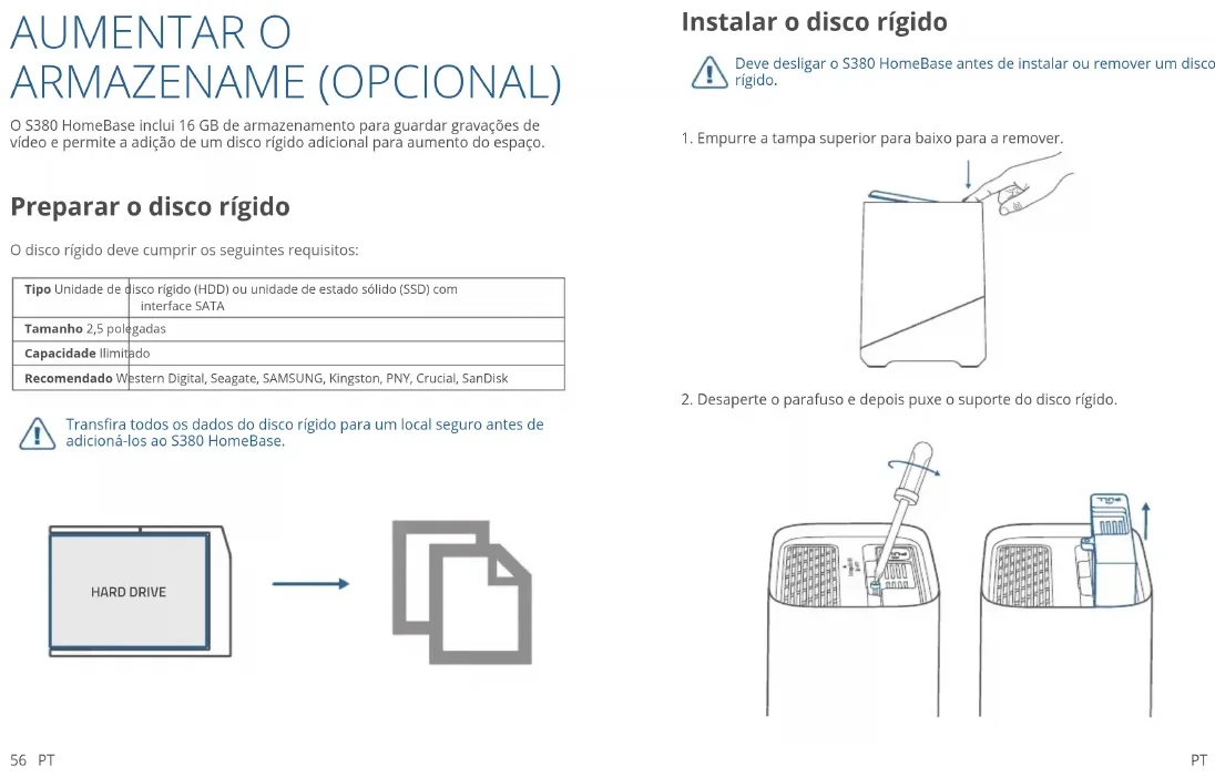 Porta de alimentação56 PT PT 57 Preparar o disco rígido O disco rígido deve cumprir os seguintes requisitos: Tipo Unidade de disco rígido (HDD) ou unidade de estado sólido (SSD) com interface SATA Tamanho 2,5 polegadas Capacidade Ilimitado Recomendado Western Digital, Seagate, SAMSUNG, Kingston, PNY, Crucial, SanDisk AUMENTAR O ARMAZENAME (OPCIONAL) O S380 HomeBase inclui 16 GB de armazenamento para guardar gravações de vídeo e permite a adição de um disco rígido adicional para aumento do espaço. Transfira todos os dados do disco rígido para um local seguro antes de adicioná-los ao S380 HomeBase. HARD DRIVE Instalar o disco rígido Deve desligar o S380 HomeBase antes de instalar ou remover um disco rígido.