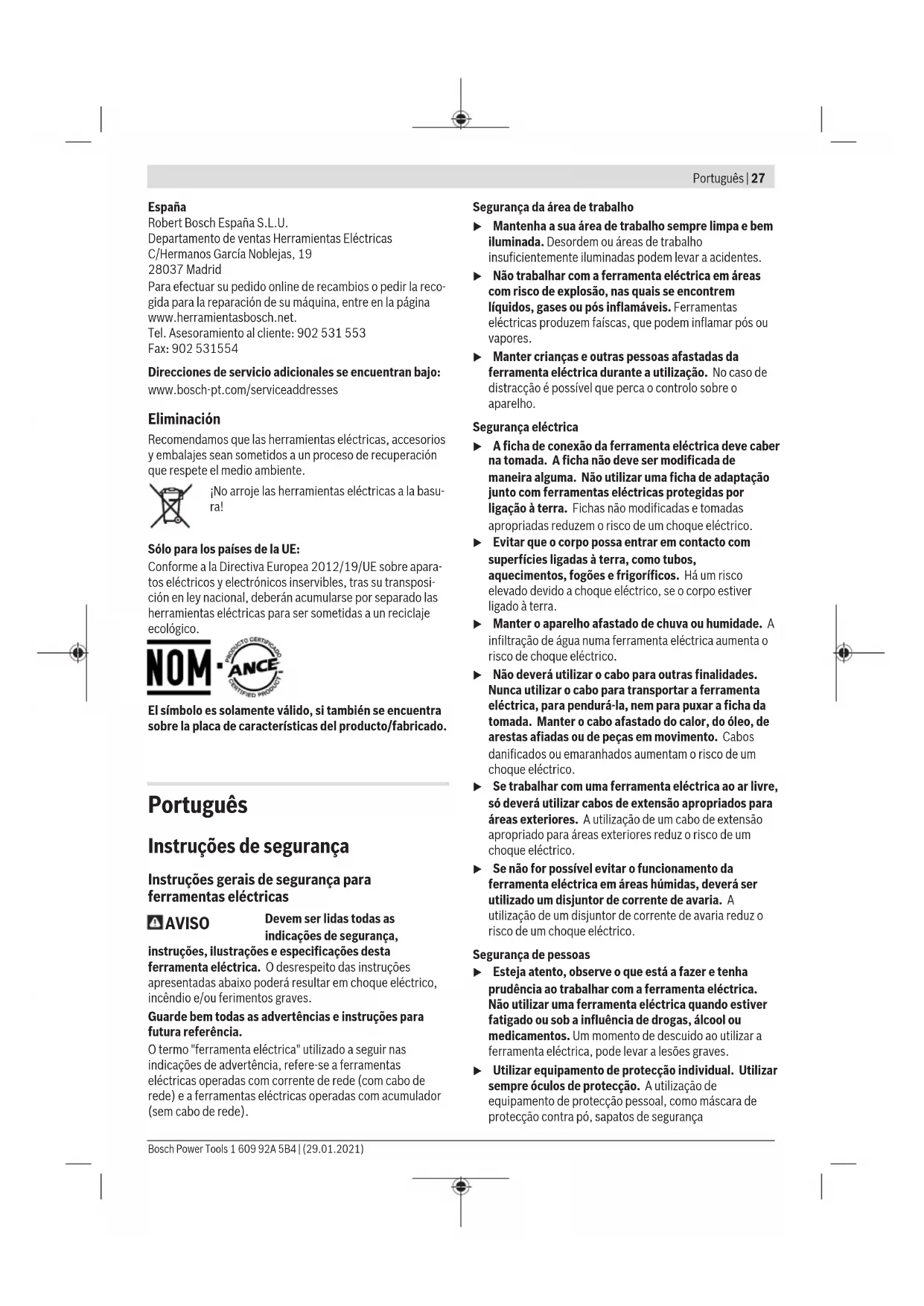 O nível de vibrações indicado nestas instruções e o valor de emissões sonoras foram medidos de acordo com um processo de medição normalizado e podem ser utilizados para a comparação de ferramentas elétricas. Também são adequados para uma avaliação provisória das emissões sonoras e de vibrações. O nível de vibrações indicado e o valor de emissões sonoras representam as aplicações principais da ferramenta elétrica. Bosch Power Tools 1 609 92A 5B4 | (29.01.2021)30 | Português Se a ferramenta elétrica for utilizada para outras aplicações, com outras ferramentas de trabalho ou com manutenção insuficiente, é possível que o nível de vibrações e de emissões sonoras seja diferente. Isto pode aumentar sensivelmente a emissão sonora e de vibrações para o período completo de trabalho. Para uma estimação exata da emissão sonora e de vibrações, também deveriam ser considerados os períodos nos quais o aparelho está desligado ou funciona, mas não está sendo utilizado. Isto pode reduzir a emissão sonora e de vibrações durante o completo período de trabalho. Além disso também deverão ser estipuladas medidas de segurança para proteger o operador contra o efeito de vibrações, como por exemplo: manutenção de ferramentas elétricas e acessórios, manter as mãos quentes e organização dos processos de trabalho. Montagem u Antes de todos trabalhos na ferramenta elétrica deverá puxar a ficha de rede da tomada. Introduzir/substituir a lâmina de serra u Para a montagem ou substituição do acessório é necessário usar luvas de proteção. Os acessórios são afiados e podem ficar quentes em caso de uso prolongado. Selecionar lâmina de serra Encontra um resumo das lâminas de serra recomendadas no final destas instruções. Utilizar apenas lâminas de serra com encabadouro de um ressalto (encabadouro T). A lâmina de serra não deveria ser mais longa do que necessário para o corte previsto. Para serrar curvas apertadas deve ser usada uma lâmina de serrar estreita. Introduzir a lâmina de serra (verfiguraA) u Limpe o encabadouro da lâmina de serra antes da colocação. Uma bainha suja não pode ser fixa de forma segura. Empurre a lâmina de serra (11), com os dentes para o sentido de corte, até engatar na admissão da lâmina de serra (9). Ao colocar a lâmina de serra, certifique-se de que as costas da lâmina de serra se encontram no sulco do rolete de guia (10). u Controle a posição firme da lâmina de serra. Uma lâmina de serra solta pode cair e causar feridas. Retirar a lâmina de serra (ver figuraB) Empurre a admissão da lâmina de serra (9) no sentido da seta para cima e retire a lâmina da serra (11). Proteção contra o arranque de aparas (verfiguraC) A proteção contra o arranque de aparas (15) (acessório) pode evitar o lascar da superfície ao serrar madeira. A proteção contra o arranque de aparas só pode ser usada com determinados tipos de lâmina de serra e apenas com um ângulo de corte de 0°. Pressione a proteção contra o arranque de aparas (15) a partir de baixo na placa base (7). Aspiração de pó/de aparas Pós de materiais como por exemplo, tintas que contém chumbo, alguns tipos de madeira, minerais e metais, podem ser nocivos à saúde. O contacto ou a inalação dos pós pode provocar reações alérgicas e/ou doenças nas vias respiratórias do utilizador ou das pessoas que se encontrem por perto. Certos pós, como por exemplo pó de carvalho e faia são considerados como sendo cancerígenos, especialmente quando juntos com substâncias para o tratamento de madeiras (cromato, produtos de proteção da madeira). Material que contém asbesto só deve ser processado por pessoal especializado. – Se possível deverá usar um dispositivo de aspiração de pó apropriado para o material. – Assegurar uma boa ventilação do local de trabalho. – É recomendável usar uma máscara de proteção respiratória com filtro da classe P2. Observe as diretivas para os materiais a serem processados, vigentes no seu país. u Evite a acumulação de pó no local de trabalho. Pós podem entrar levemente em ignição. Tampa de cobertura Monte a tampa de cobertura (13), antes de ligar a ferramenta elétrica a um sistema de aspiração de pó. Coloque a tampa de cobertura (13) na ferramenta elétrica de forma a que os suportes engatem nos entalhes da caixa. Retire a tampa de cobertura (13) para trabalhos sem aspiração de pó e para cortes em meia-esquadria. Para tal é necessário comprimir a capa na altura dos dispositivos de fixação laterais puxar pela frente para retirá-la. Conectar a aspiração de pó Insira uma mangueira de aspiração (5) (acessório) no bocal de aspiração (6). Ligue a mangueira de aspiração (5) a um aspirador (acessório). Encontra um resumo da ligação aos diferentes aspiradores no final deste manual. Para uma excelente aspiração utilize se possível uma proteção contra o arranque de aparas (15). O aspirador de pó deve ser apropriado para o material a ser trabalhado. Utilizar um aspirador especial para aspirar pó que seja extremamente nocivo à saúde, cancerígeno ou seco. Funcionamento Modos de operação u Antes de todos trabalhos na ferramenta elétrica deverá puxar a ficha de rede da tomada. 1 609 92A 5B4 | (29.01.2021) Bosch Power ToolsPortuguês | 31 Ajustar o movimento pendular O movimento pendular ajustável em quatro níveis permite a adequação perfeita da velocidade de corte, do rendimento de corte e da imagem de corte ao material a processar. Com a alavanca de ajuste (8) pode ajustar o movimento pendular mesmo durante o funcionamento. Nível0 nenhum movimento pendular NívelI pequeno movimento pendular NívelII médio movimento pendular NívelIII grande movimento pendular O nível de movimento pendular ideal para a respetiva aplicação pode ser determinado através de uma tentativa prática. Aplicam-se as seguintes recomendações: – Selecione o nível de movimento