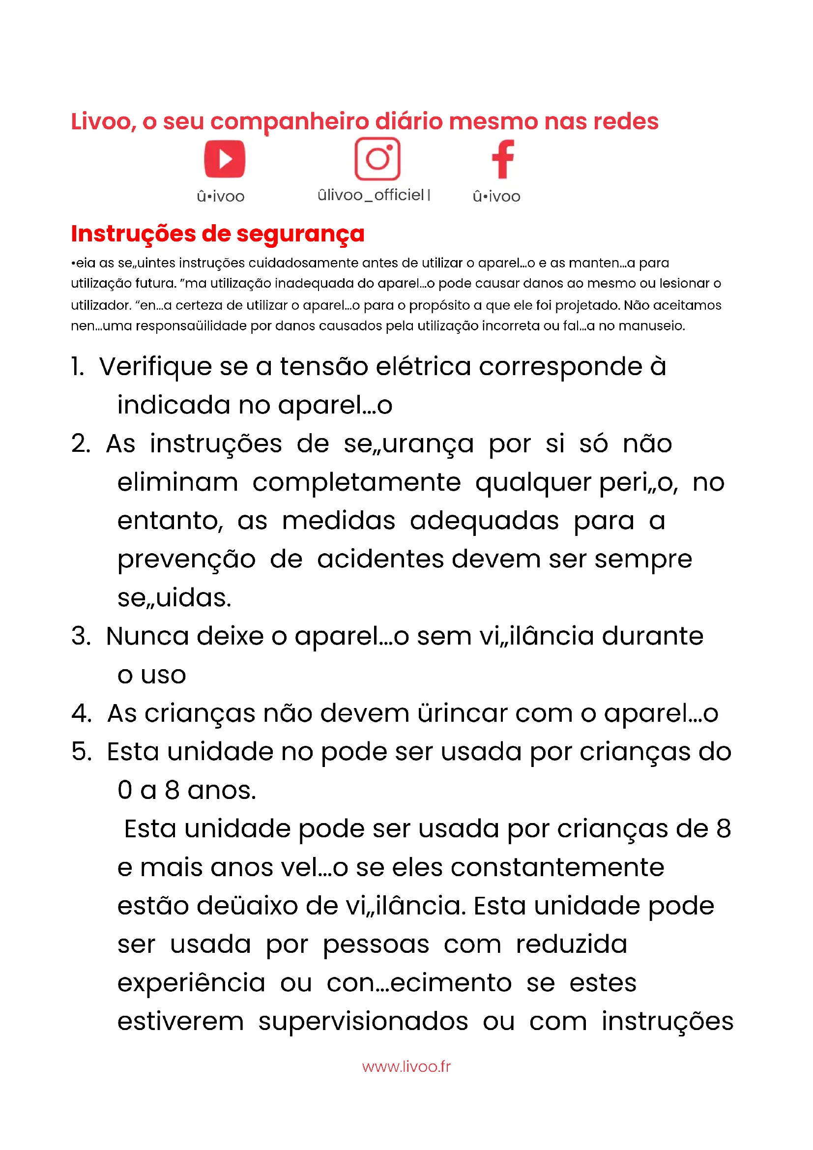 0 a 8 anos. Esta unidade pode ser usada por crianças de 8 e mais anos velho se eles constantemente estão debaixo de vigilância. Esta unidade pode ser usada por pessoas com reduzida experiência ou conhecimento se estes estiverem supervisionados ou com instruções @livoo_officiel