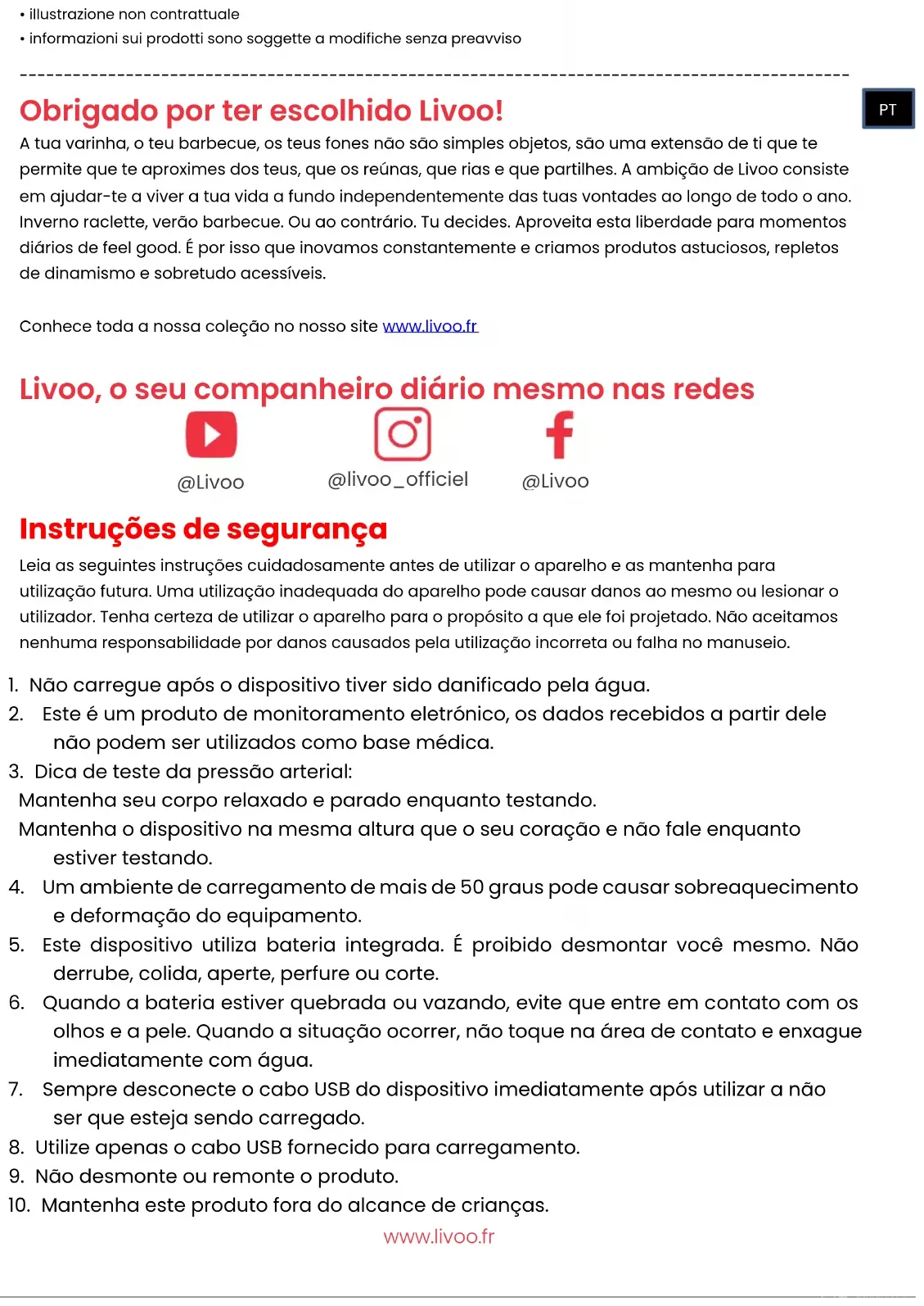 Obrigado por ter escolhido Livoo! A tua varinha, o teu barbecue, os teus fones não são simples objetos, são uma extensão de ti que te permite que te aproximes dos teus, que os reúnas, que rias e que partilhes. A ambição de Livoo consiste em ajudar-te a viver a tua vida a fundo independentemente das tuas vontades ao longo de todo o ano. Inverno raclette, verão barbecue. Ou ao contrário. Tu decides. Aproveita esta liberdade para momentos diários de feel good. É por isso que inovamos constantemente e criamos produtos astuciosos, repletos de dinamismo e sobretudo acessíveis. Conhece toda a nossa coleção no nosso site www.livoo.fr Livoo, o seu companheiro diário mesmo nas redes