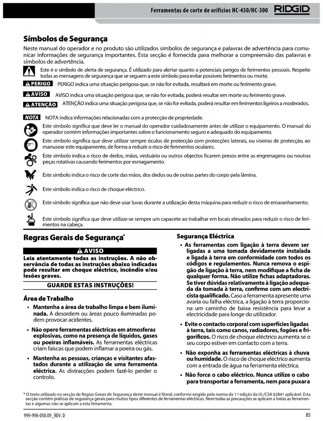 999-998-050.09_REV. DLeia estas precauções cuidadosamente antes de utilizar esta Ferramenta de Corte de Orifícios para reduzir o risco de choque eléctrico e lesões pes‑soais graves. GUARDE TODOS OS AVISOS E INSTRUÇÕES PARA REFERÊNCIA FUTURA! Guarde este manual juntamente com a máquina, para uti- lização pelo operador.