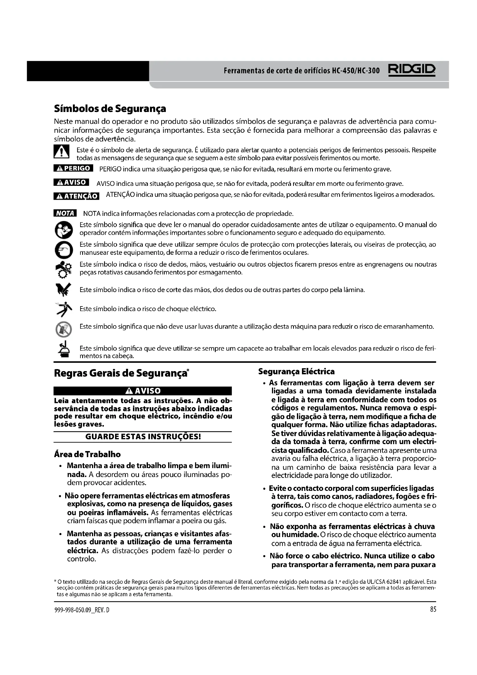 999-998-050.09_REV. DLeia estas precauções cuidadosamente antes de utilizar esta Ferramenta de Corte de Orifícios para reduzir o risco de choque eléctrico e lesões pes‑soais graves. GUARDE TODOS OS AVISOS E INSTRUÇÕES PARA REFERÊNCIA FUTURA! Guarde este manual juntamente com a máquina, para uti- lização pelo operador.