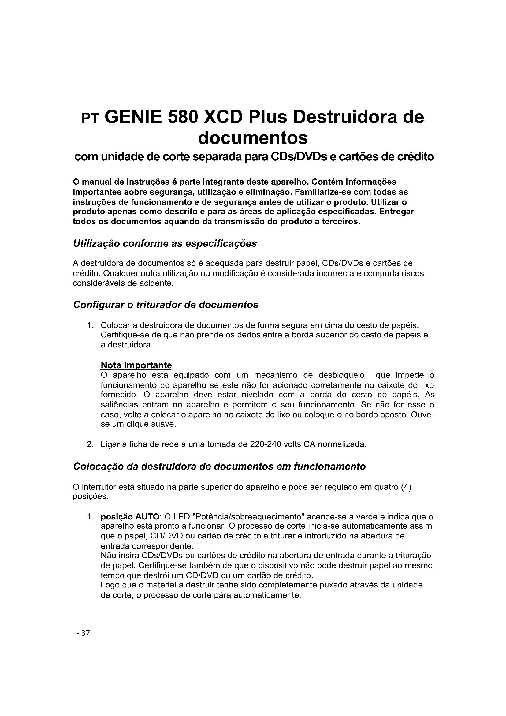 Il marchio CE sull’apparecchio attesta la conformità. La dichiarazione di conformità è disponibile su www.go-europe.com- 37 - PT GENIE 580 XCD Plus Destruidora de documentos com unidade de corte separada para CDs/DVDs e cartões de crédito O manual de instruções é parte integrante deste aparelho. Contém informações importantes sobre segurança, utilização e eliminação. Familiarize-se com todas as instruções de funcionamento e de segurança antes de utilizar o produto. Utilizar o produto apenas como descrito e para as áreas de aplicação especificadas. Entregar todos os documentos aquando da transmissão do produto a terceiros.