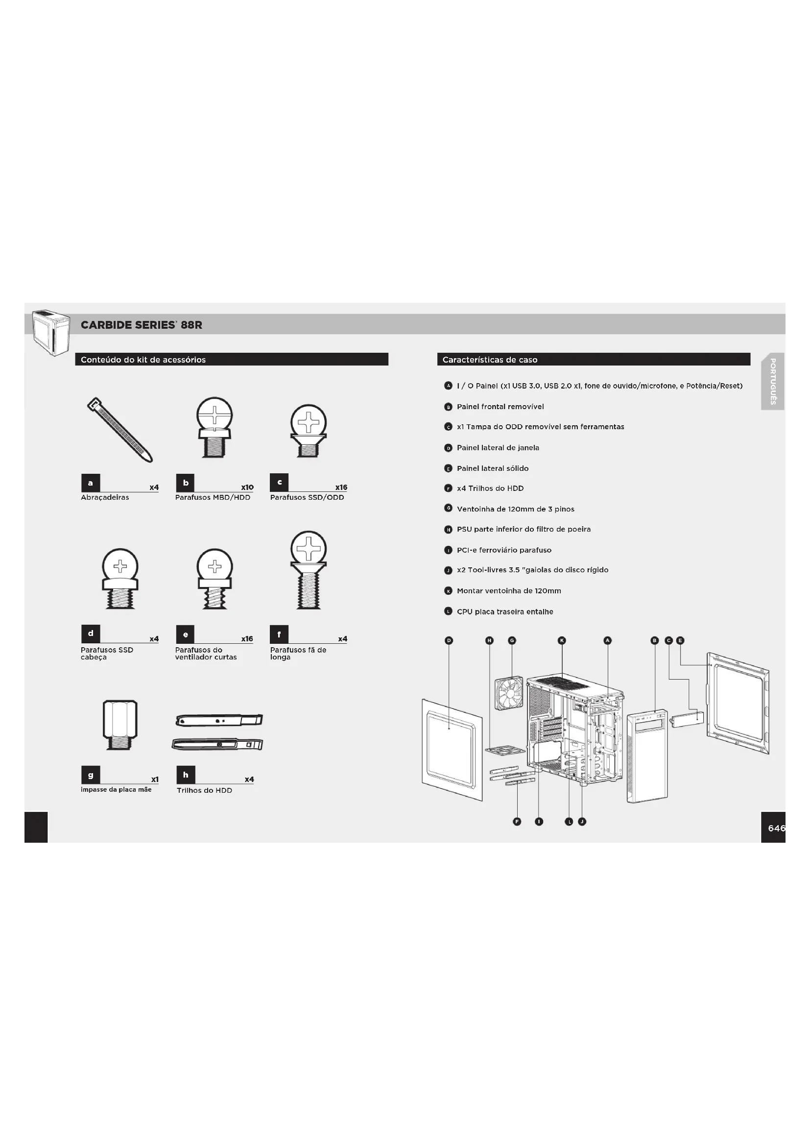 88R 6867PORTUGUÊS8. Instalando SSDs6. Instalação de uma ODDPara remover o painel frontal (painel frontal), segure a guia localizada na fáscia inferior e puxe para fora.Em primeiro lugar, remover o painel frontal 5.25" tampa do compartimento de unidade, em seguida, deslize o ODD no compartimento de unidade até se fixar livre de ferramentas, garantindo a unidade. Para liberar uma unidade óptica, empurre a guia sem ferramentas, em seguida, puxe a unidade para fora.Etapa 1 – Prenda os trilhos laterais à unidade com presas e conectores da unidade voltados para a mesma direção.Etapa 2 – Deslize a montagem de unidade e trilho no compartimento do HDD por trás da placa-mãe conforme mostrado.Insira uma SSD na bandeja de montagem e prenda com parafusos conforme mostrado.Primeiro 88R STEP5 88R STEP6 88R STEP6 Segundo 88R Step 8 Etapa 1 88R STEP7 88R STEP7 Etapa 2 7. Instalando HDDs5. Remoção do painel frontalCARBIDE SERIES