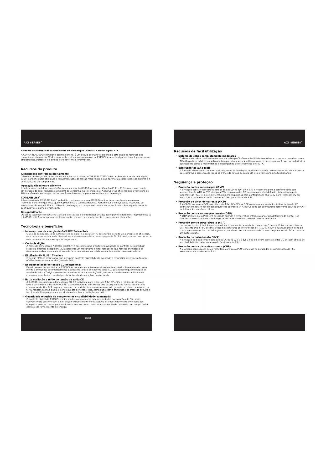 Parabéns pela compra de sua nova fonte de alimentação CORSAIR AX1600i digital ATX. A CORSAIR AX1600i é um novo design pioneiro. É um desvio de PSUs tradicionais e está cheia de recursos que tornará a montagem do PC dos seus sonhos ainda mais prazerosa. A AX1600i apresenta algumas tecnologias novas e empolgantes, portanto leia abaixo para obter mais informações. Recursos do produto Alimentação controlada digitalmente Diferente de designs de fontes de alimentação tradicionais, a CORSAIR AX1600i usa um Processador de sinal digital (DSP) para eficiência otimizada e regulamentação de tensão mais rígida, o que aprimora a estabilidade do sistema e a confiabilidade do componente. Operação silenciosa e eficiente Atualizar para digital fornece eficiência aumentada. A AX1600i possui certificação 80 PLUS® Titinum, o que resulta em geração de calor reduzida e um perfil de ventoinha mais silencioso. A AX1600i é tão eficiente que a ventoinha de 140mm não roda em cargas baixas para fornecimento completamente silencioso de energia. CORSAIR Link