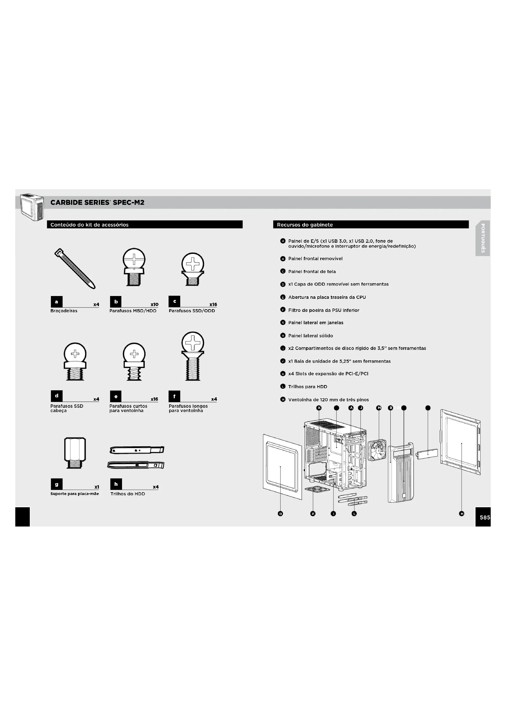 Trilhos do HDD Painel de E/S (x1 USB 3.0, x1 USB 2.0, fone de ouvido/microfone e interruptor de energia/redefinição) Painel frontal removível Painel frontal de tela x1 Capa de ODD removível sem ferramentas Abertura na placa traseira da CPU Filtro de poeira da PSU inferior Painel lateral em janelas Painel lateral sólido x2 Compartimentos de disco rígido de 3,5” sem ferramentas x1 Baia de unidade de 5,25" sem ferramentas x4 Slots de expansão de PCI-E/PCI Trilhos para HDD Ventoinha de 120 mm de três pinos
