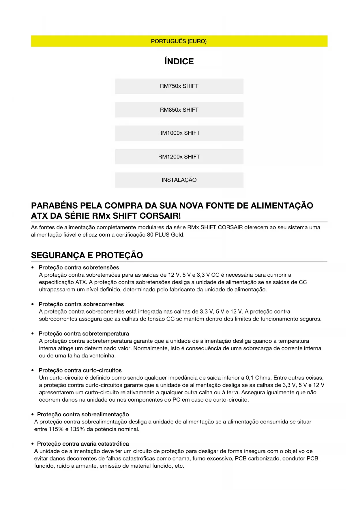 As fontes de alimentação completamente modulares da série RMx SHIFT CORSAIR oferecem ao seu sistema uma alimentação fiável e eficaz com a certificação 80 PLUS Gold. PARABÉNS PELA COMPRA DA SUA NOVA FONTE DE ALIMENTAÇÃO ATX DA SÉRIE RMx SHIFT CORSAIR! ÍNDICE RM750x SHIFT RM850x SHIFT RM1000x SHIFT RM1200x SHIFT INSTALAÇÃO1 PORTUGUÊS (EURO) PORTUGUÊS (EURO) MESA DE ALIMENTAÇÃO RM750x SHIFT CORSAIR CARGA MÁX. SAÍDA MÁX.