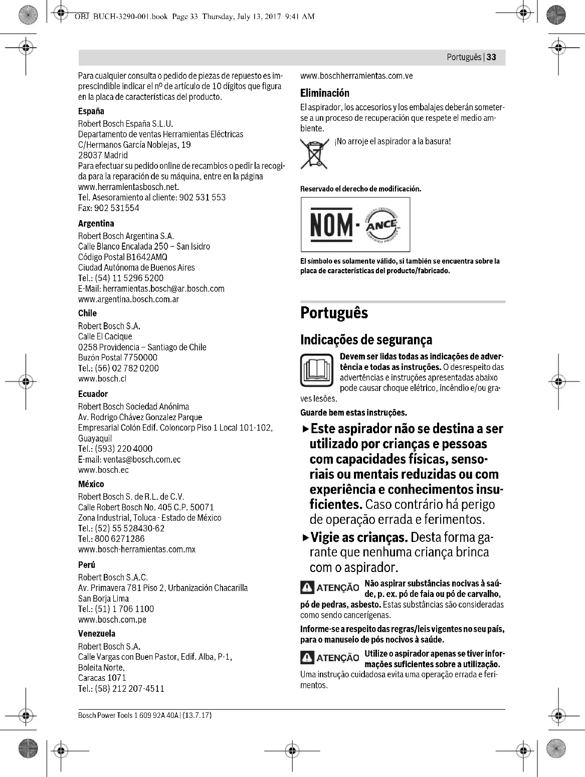 Cambie un filtro dañado. – Coloque el soporte del filtro 29 sobre el filtro limpio/nuevo 20. – Ponga el soporte del filtro 29 junto con el filtro 20 sobre la cesta del filtro 30 y gire el soporte del filtro 29 hasta el to- pe en sentido de giro “ ”. – Monte la parte superior del aspirador 8 y cierre los cierres 9. Depósito – Limpie de vez en cuando el depósito 1 con un detergente no abrasivo usual en el comercio, y déjelo secar. Almacenaje y transporte (ver figura I) – Enrolle el cable de la red alrededor del asa de transporte 6. – Inserte los tubos de aspiración 26 en los soportes 12. – Coloque el tubo de aspiración 17 alrededor de la parte su- perior del aspirador y cuelgue el asidero 16 en el soporte 11. – Solamente transporte el aspirador sujetándolo del asa 6. – Guarde el aspirador en lugar seco y asegúrelo contra un uso indebido. – Para bloquear las ruedas orientables 10 presione hacia abajo el freno de la rueda 14. Eliminación de fallos Servicio técnico y atención al cliente El servicio técnico le asesorará en las consultas que pueda Ud. tener sobre la reparación y mantenimiento de su produc- to, así como sobre piezas de recambio. Los dibujos de despie- ce e informaciones sobre las piezas de recambio los podrá ob- tener también en internet bajo: www.bosch-pt.com Nuestro equipo de asesores técnicos le orientará gustosa- mente en cuanto a la adquisición, aplicación y ajuste de los productos y accesorios. Problema Solución La turbina de aspiración no funciona. – Examinar el cable de red, el enchufe de red, el fusible y la caja de enchufe. GAS 15 PS: El selector de modos de operación 4 se encuentra en “Sistema automático de arranque/paro”. – Girar el selector de modos de operación 4 hacia el símbolo “Aspirar” o conec- tar la herramienta eléctrica que va enchufada a la toma de corriente 3. La turbina de aspiración se desconecta. –Vaciar el depósito 1. La turbina de aspiración no se pone a funcionar tras haber vaciado el depósito. – Desconectar el aspirador, esperar 5 segundos, y volverlo a conectar enton- ces. La potencia de aspiración disminuye. – Eliminar las obstrucciones de la boquilla de aspiración, el tubo de aspiración 26, la manguera de aspiración 17 o el filtro 20. – Cambiar el saco de plástico 19 o la bolsa colectora de polvo. – Encastrar correctamente el soporte del filtro 29. – Montar correctamente la parte superior del aspirador 8 y cerrar los cierres 9. – Cambiar el filtro 20. Expulsión de polvo al aspirar. – Verificar el correcto montaje del filtro 20. – Cambiar el filtro 20. No se lleva a cabo la desconexión automática (aspiración en húmedo). La desconexión automática no funciona si se aspiran líquidos que no son con- ductores eléctricos o al formarse espuma. – Controlar continuamente el nivel. No funciona la limpieza del filtro. – Apretar el interruptor SFC 7. OBJ_BUCH-3290-001.book Page 32 Thursday, July 13, 2017 9:41 AMPortuguês | 33Bosch Power Tools 1 609 92A 40A | (13.7.17)Para cualquier consulta o pedido de piezas de repuesto es im-prescindible indicar el nº de artículo de 10 dígitos que figura en la placa de características del producto.EspañaRobert Bosch España S.L.U.Departamento de ventas Herramientas EléctricasC/Hermanos García Noblejas, 1928037 MadridPara efectuar su pedido online de recambios o pedir la recogi-da para la reparación de su máquina, entre en la página www.herramientasbosch.net.Tel. Asesoramiento al cliente: 902 531 553Fax: 902 531554ArgentinaRobert Bosch Argentina S.A.Calle Blanco Encalada 250 – San IsidroCódigo Postal B1642AMQCiudad Autónoma de Buenos AiresTel.: (54) 11 5296 5200E-Mail: herramientas.bosch@ar.bosch.comwww.argentina.bosch.com.arChileRobert Bosch S.A.Calle El Cacique0258 Providencia – Santiago de ChileBuzón Postal 7750000Tel.: (56) 02 782 0200www.bosch.clEcuadorRobert Bosch Sociedad AnónimaAv. Rodrigo Chávez Gonzalez ParqueEmpresarial Colón Edif. Coloncorp Piso 1 Local 101-102,GuayaquilTel.: (593) 220 4000E-mail: ventas@bosch.com.ecwww.bosch.ecMéxicoRobert Bosch S. de R.L. de C.V.Calle Robert Bosch No. 405 C.P. 50071Zona Industrial, Toluca - Estado de MéxicoTel.: (52) 55 528430-62Tel.: 800 6271286www.bosch-herramientas.com.mx Perú Robert Bosch S.A.C.Av. Primavera 781 Piso 2, Urbanización ChacarillaSan Borja LimaTel.: (51) 1 706 1100www.bosch.com.peVenezuelaRobert Bosch S.A.Calle Vargas con Buen Pastor, Edif. Alba, P-1, Boleita Norte, Caracas 1071Tel.: (58) 212 207-4511www.boschherramientas.com.ve Eliminación El aspirador, los accesorios y los embalajes deberán someter-se a un proceso de recuperación que respete el medio am-biente.¡No arroje el aspirador a la basura!Reservado el derecho de modificación. El símbolo es solamente válido, si también se encuentra sobre la placa de características del producto/fabricado. Português Indicações de segurança Devem ser lidas todas as indicações de adver-tência e todas as instruções. O desrespeito das advertências e instruções apresentadas abaixo pode causar choque elétrico, incêndio e/ou gra-ves lesões.Guarde bem estas instruções. Este aspirador não se destina a ser utilizado por crianças e pessoas com capacidades físicas, senso- riais ou mentais reduzidas ou com experiência e conhecimentos insu- ficientes. Caso contrário há perigo de operação errada e ferimentos. Vigie as crianças. Desta forma ga- rante que nenhuma criança brinca com o aspirador. Não aspirar substâncias nocivas à saú-de, p. ex. pó de faia ou pó de carvalho, pó de pedras, asbesto. Estas substâncias são consideradas como sendo cancerígenas.Informe-se a respeito das regras/leis vigentes no seu país, para o manuseio de pós nocivos à saúde.Utilize o aspirador apenas se tiver infor-mações suficientes sobre a utilização. Uma instrução cuidadosa evita uma operação errada e feri-mentos. ATENÇÃO ATENÇÃO OBJ_BUCH-3290-001.book Page 33 Thursday, J