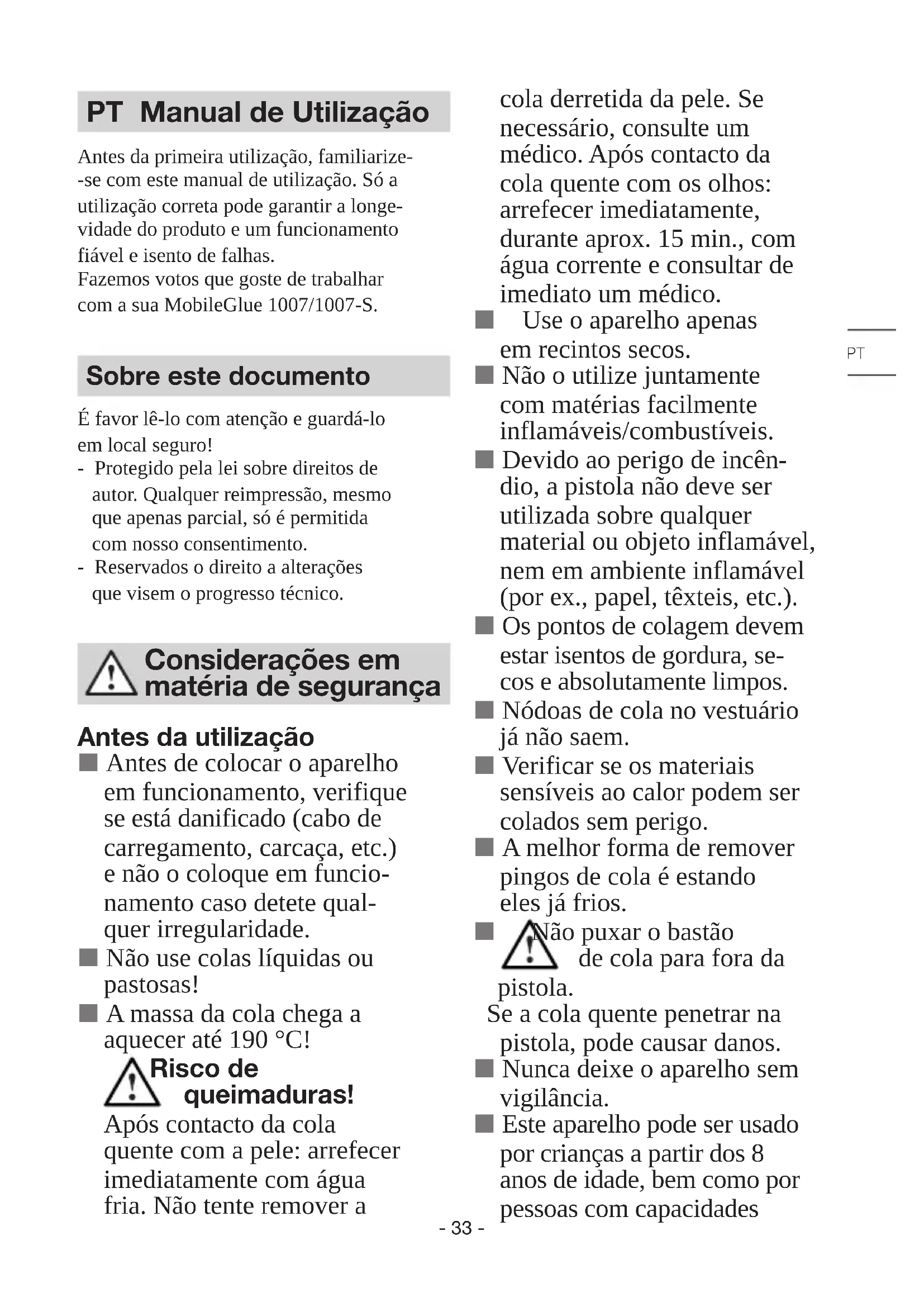 AÑOS DE FABRICANTE- 33 - PT Manual de Utilização Antes da primeira utilização, familiarize- -se com este manual de utilização. Só a utilização correta pode garantir a longe- vidade do produto e um funcionamento fiável e isento de falhas. Fazemos votos que goste de trabalhar com a sua MobileGlue 1007/1007-S. Sobre este documento É favor lê-lo com atenção e guardá-lo em local seguro! - Protegido pela lei sobre direitos de autor. Qualquer reimpressão, mesmo que apenas parcial, só é permitida com nosso consentimento. - Reservados o direito a alterações que visem o progresso técnico. Antes da utilização Antes de colocar o aparelho em funcionamento, verifique se está danificado (cabo de carregamento, carcaça, etc.) e não o coloque em funcio- namento caso detete qual- quer irregularidade. Não use colas líquidas ou pastosas! A massa da cola chega a aquecer até 190 °C! Risco de queimaduras! Após contacto da cola quente com a pele: arrefecer imediatamente com água fria. Não tente remover a Considerações em matéria de segurança cola derretida da pele. Se necessário, consulte um médico. Após contacto da cola quente com os olhos: arrefecer imediatamente, durante aprox. 15 min., com água corrente e consultar de imediato um médico. Use o aparelho apenas em recintos secos. Não o utilize juntamente com matérias facilmente inflamáveis/combustíveis. Devido ao perigo de incên- dio, a pistola não deve ser utilizada sobre qualquer material ou objeto inflamável, nem em ambiente inflamável (por ex., papel, têxteis, etc.). Os pontos de colagem devem estar isentos de gordura, se- cos e absolutamente limpos. Nódoas de cola no vestuário já não saem. Verificar se os materiais sensíveis ao calor podem ser colados sem perigo. A melhor forma de remover pingos de cola é estando eles já frios. Não puxar o bastão de cola para fora da pistola. Se a cola quente penetrar na pistola, pode causar danos. Nunca deixe o aparelho sem vigilância. Este aparelho pode ser usado por crianças a partir dos 8 anos de idade, bem como por pessoas com capacidades PT- 34 - físicas, sensoriais ou mentais reduzidas, ou com falta de experiência e conhecimentos, se forem vigiadas ou informadas relativamente à utilização segura do aparelho, acabando por compreender os riscos que daí advêm. As crianças não podem brincar com o aparelho. A limpeza e a manutenção dos utilizadores não podem ser executadas por crianças sem vigilância. O funcionamento perfeito da pistola de termocolagem só é garantido se forem usados exclusivamente bastões de cola originais da STEINEL. Cabo de carregamento USB Mantenha o cabo de carre- gamento limpo. A sujidade representa um perigo de choque elétrico. Guarde o aparelho a uma tem- peratura entre 0 °C a 35 °C. Carregue o aparelho somen- te com o cabo de carrega- mento USB fornecido (do tipo 15.3841). Não carregue baterias recarregáveis de outros fabricantes. Caso contrário, existe o risco de incêndio e explosão. Bateria Nunca abra a pistola nem a bateria. Existe o perigo de curto-circuito. A bateria não pode ser removida. Em caso Utilização prevista Esta ferramenta elétrica só se destina a fins de colagem com cola sem solvente na área doméstica, para materiais de bricolage e componentes de móveis. de problemas, dirija-se ao ponto de venda. A bateria de iões de lítio po- de ser carregada a qualquer momento, sem reduzir a vida útil. A interrupção do proces- so de carregamento não pre- judica a bateria recarregável. Se não utilizar o aparelho du- rante muito tempo, guarde-o com a bateria carregada. Isso prolongará a vida útil da bateria de iões de lítio. Se as baterias recarregáveis forem danificadas ou utili- zadas de forma imprópria, podem ser gerados vapores. Em tais casos, assegure a entrada de ar fresco e, se se sentir mal, consulte um médico. Os vapores podem irritar as vias respiratórias. Área de aplicação Caneta de termocolagem sem fios com bateria de iões de lítio. O cola-tudo ideal para reparar, decorar e fazer trabalhos manuais. Adequada para: papel, cartolina, cortiça, madeira, pele, têxteis, plástico, cerâmi- ca, material esponjoso, azulejos...- 35 - Descrição do aparelho Cabo de carregamento USB Indicador LED Entrada para cabo de carregamento Botão LIG/DESL Gatilho de avanço Bastão de cola Funcionamento e manuseio ■ Antes de utilizar a pistola pela primei- ra vez, carregue completamente a bateria (2-3 h) para prolongar a vida útil da bateria recarregável. (v. Carre- gamento/funcionamento) ■ Enfie o bastão de cola pela parte de trás, no canal de aquecimento. ■ No ato da primeira colocação em funcionamento, é necessário acionar várias vezes o avanço do bastão, pa- ra encher a câmara de aquecimento com cola. É possível que seja neces- sário empurrar um pouco o bastão de cola. ■ Para evitar que a pistola seja ligada inadvertidamente, mantenha o botão premido durante aprox. 2 s. O LED verde pisca durante 15 s. ■ Acione o avanço e aplique a cola de um lado. ■ Junte com força os materiais que pre- tende colar e corrija o alinhamento, caso seja necessário. ■ Após muito pouco tempo (aprox. 2 minutos), o ponto de colagem já pode ser sujeito a carga! ■ A colagem puntiforme é recomendá- vel para a colagem de peças compri- das de grandes superfícies. ■ Também se pode colar peças de espuma dura (por ex., esferovite) sem qualquer problema. Apenas é neces- sário prestar atenção para não aplicar a cola quente no esferovite em vez de ser na base. ■ Para colar têxteis, ou outros mate- riais semelhantes, recomendamos a aplicação da cola em "ziguezague". ■ Depois de a utilizar, deixar arrefecer a pistola. Carregamento/funcionamento A bateria da MobileGlue 1007/1007-S é fornecida com carga parcial. Carregue completamente a bateria antes da pri- meira utilização (aprox. 2-3 horas) para que possa ficar garantida a sua capaci- dade plena. A MobileGlue 1